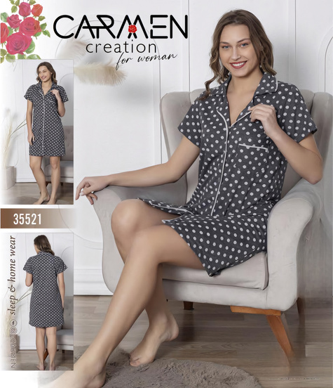 Damska koszula nocna w białe groszki na szarym tle. Praktyczna koszula rozpinana z kieszonką na lewej piersi. Długość przed kolano, krótki rękawek, kołnierzyk przy dekolcie.