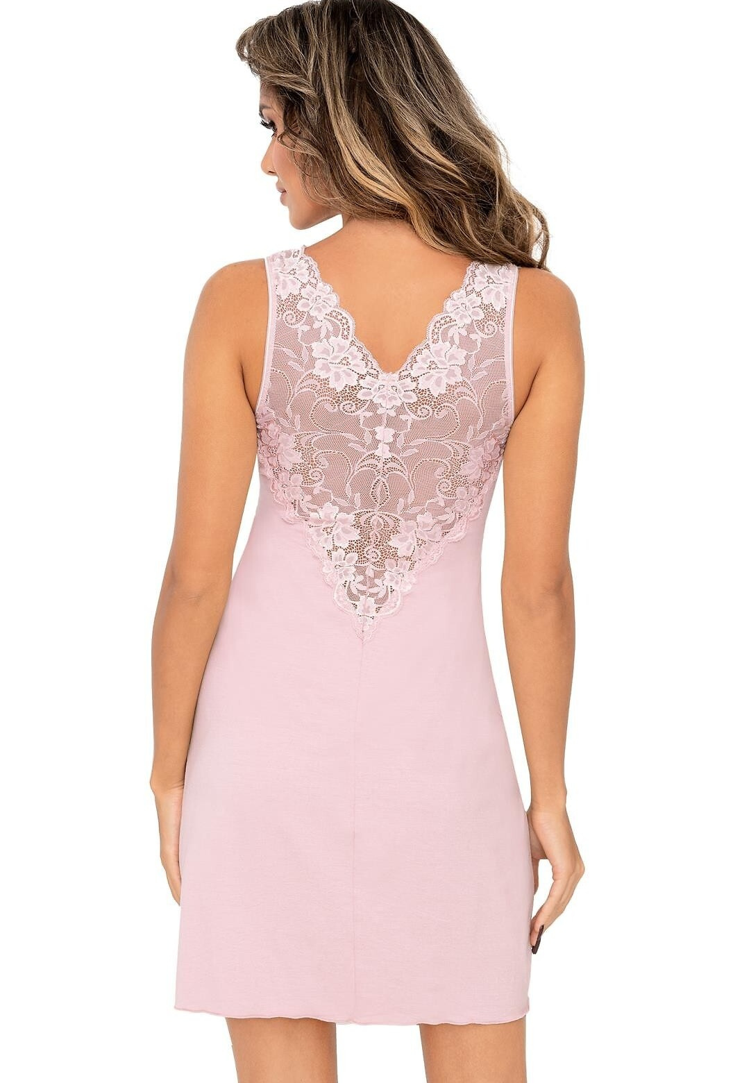 Elegancka damska koszulka wykonana z miękkiej i przyjemnej w dotyku wiskozy. Jej kobiecy charakter podkreśla ażurowa koronka o kwiatowym wzorze, zdobiąca linię biustu, ramiączka oraz tył. Miseczki zostały delikatnie podszyte materiałem dla większego komfortu. Model posiada szerokie, nieregulowane ramiączka i lekko rozszerza się ku dołowi, zapewniając swobodę ruchów. Długość przed kolano sprawia, że koszulka prezentuje się zarówno zmysłowo, jak i elegancko.