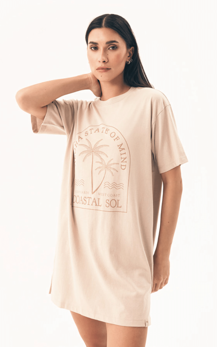Bawełniana koszula nocna w modnym, beżowym odcieniu. Koszula o luźnym komfortowym kroju. Krótki rękaw, dekolt okrągły a długość do połowy uda. Na środku koszulki w przedniej części ozdobna grafika.