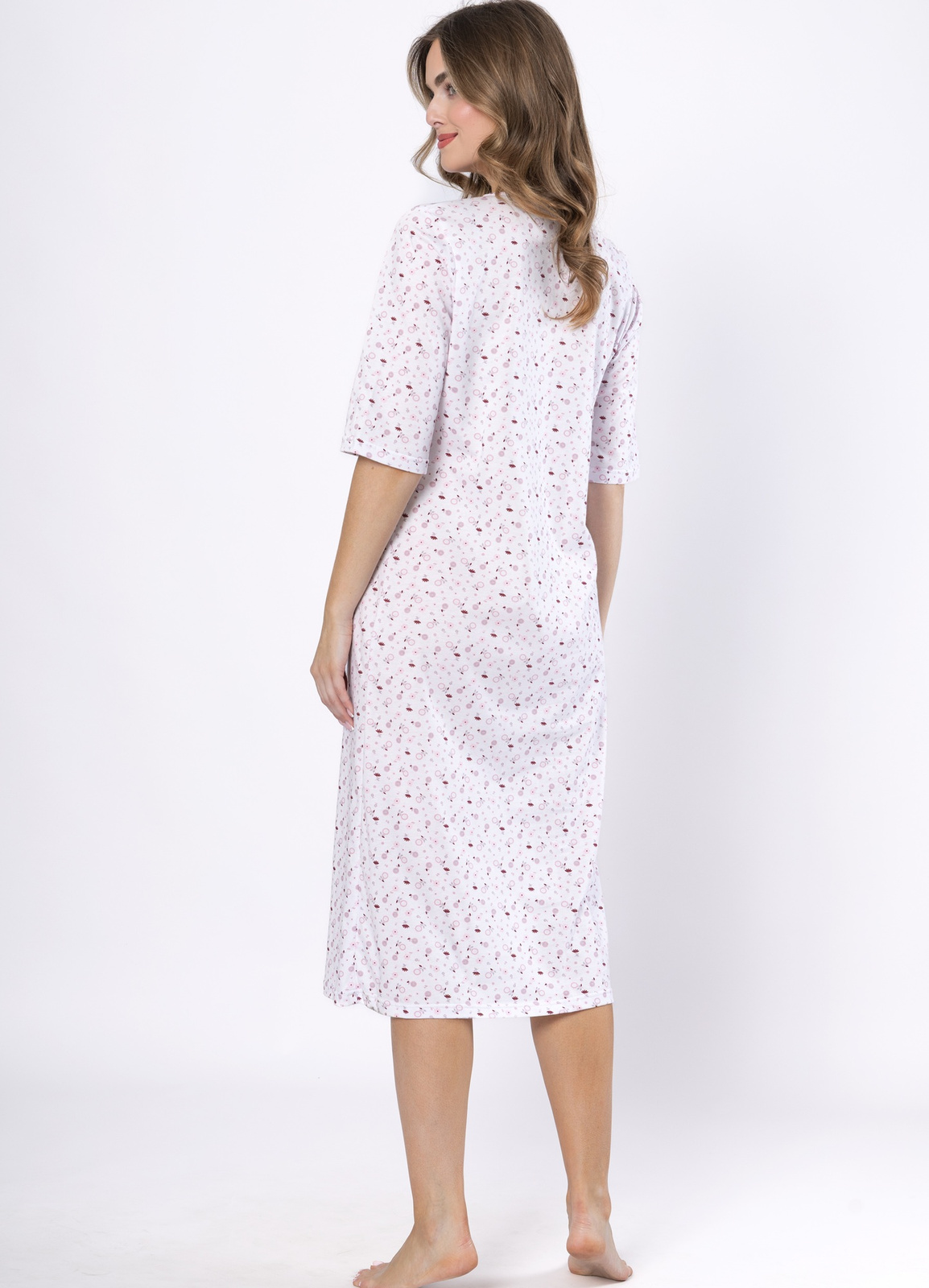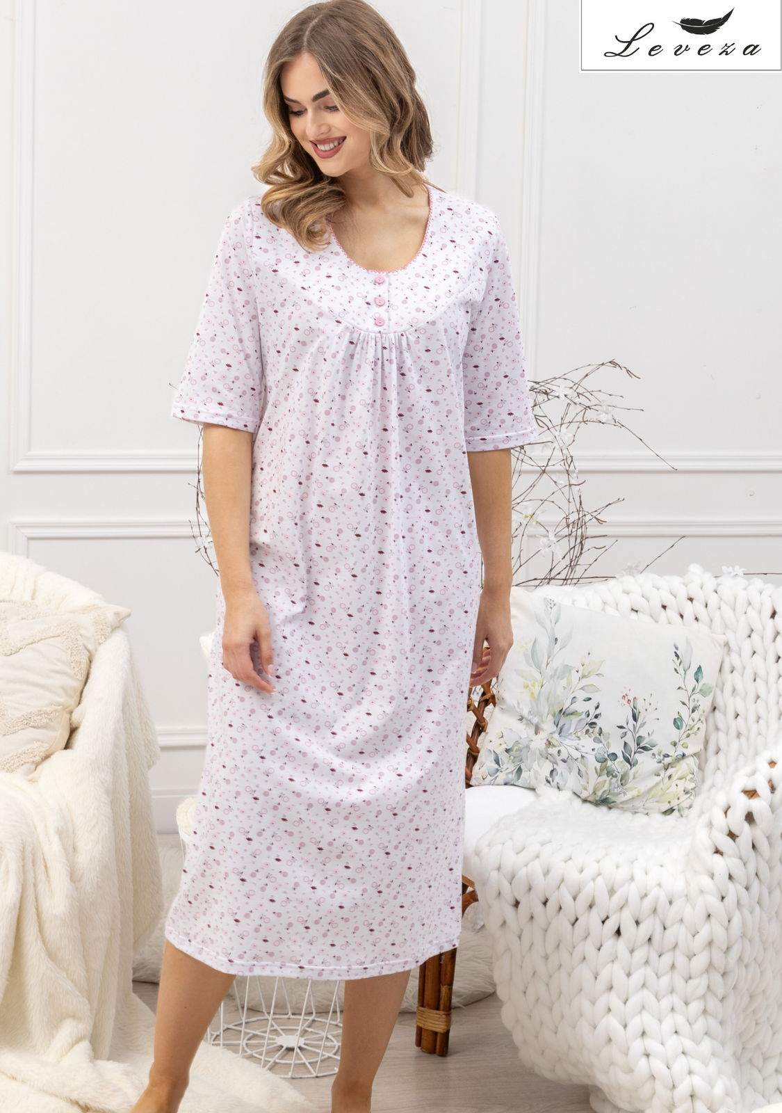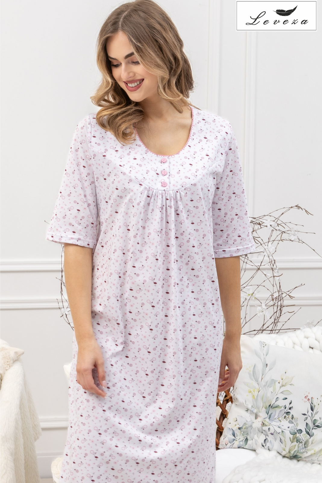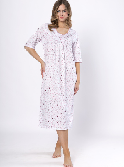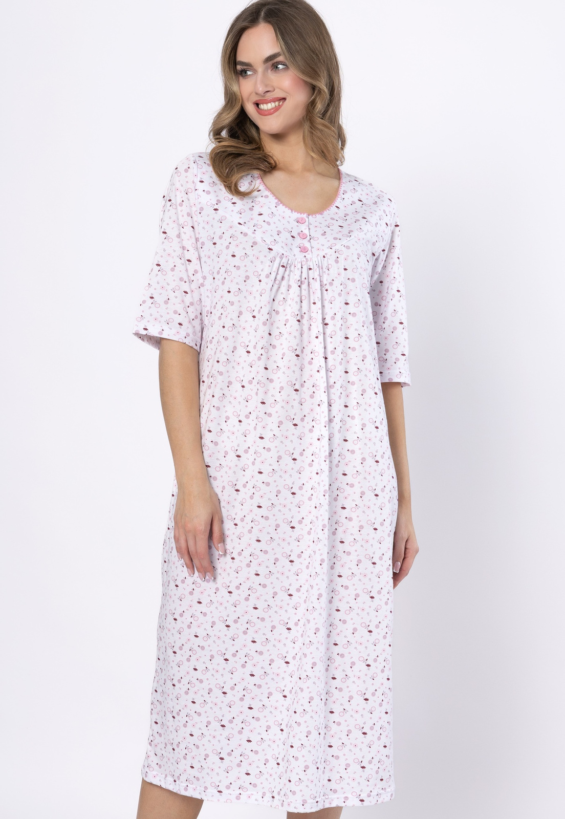 Damska koszula wykonana z wysokiej jakości bawełny. Model z krótkim rękawem, delikatnie marszczonym karczkiem i dekoltem zapinanym na guziki. Długość za kolano.