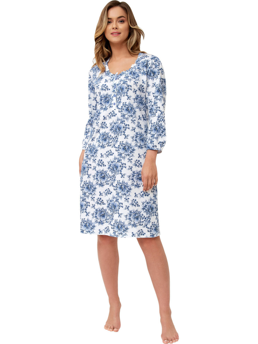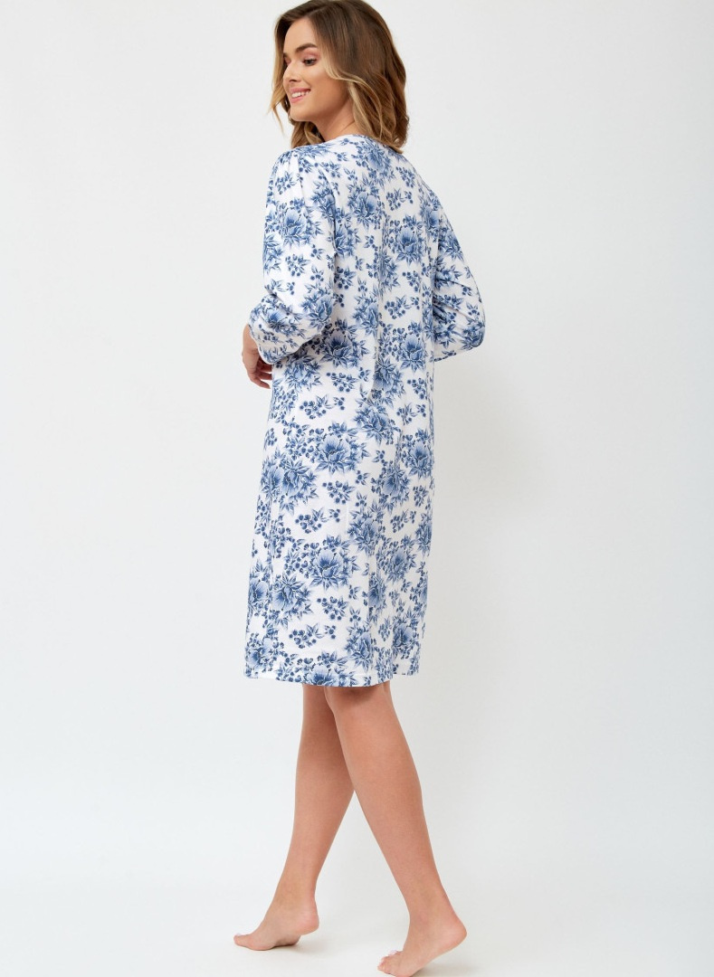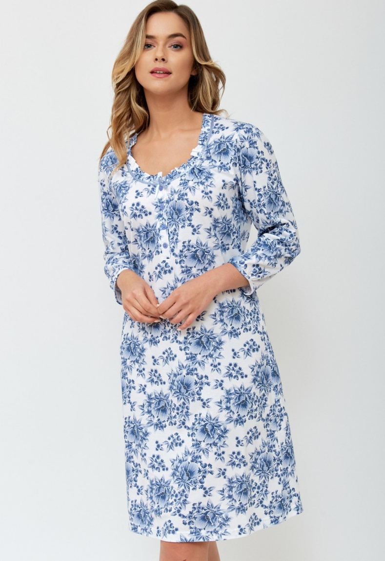 Bawełniana koszula nocna polskiej marki Leveza. Koszula w białym kolorze cała pokryta niebieskim, kwiatowym wzorem. Długość przed kolano, rękaw 7/8. Okrągły dekolt wykończony falbanką.