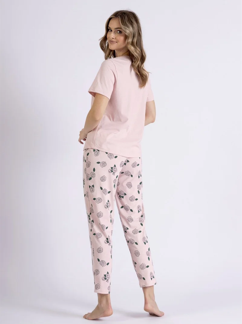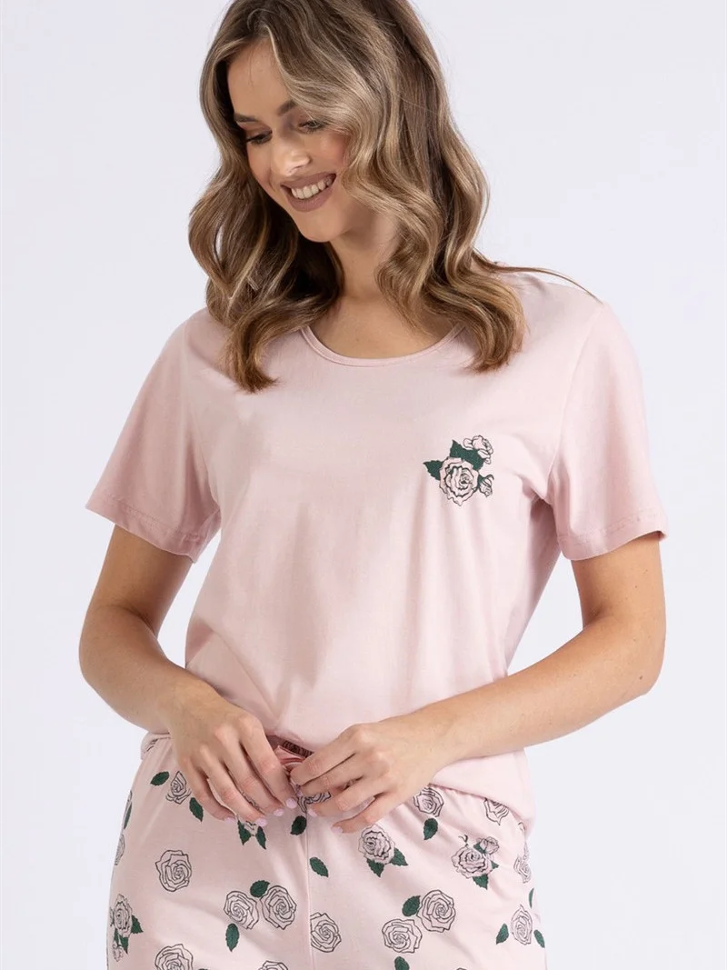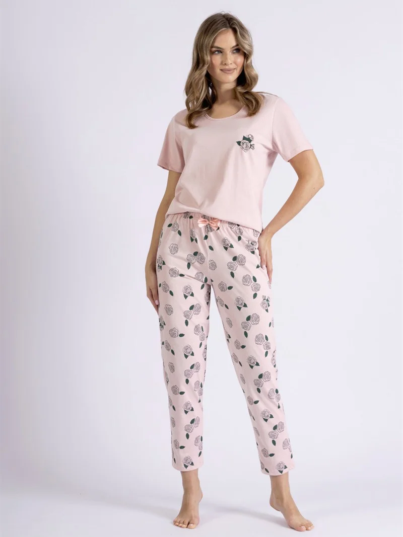 Piżama damska wykonana z bawełny. Koszulka z krótkim rękawem i ozdobnym nadrukiem na piersi. Dekolt okrągły. Do kompletu wzorzyste spodnie o długości 7/8. W pasie wygodna gumka i ozdobna satynowa kokardka.