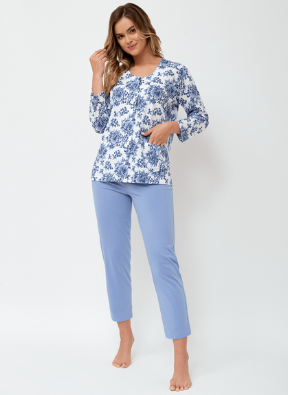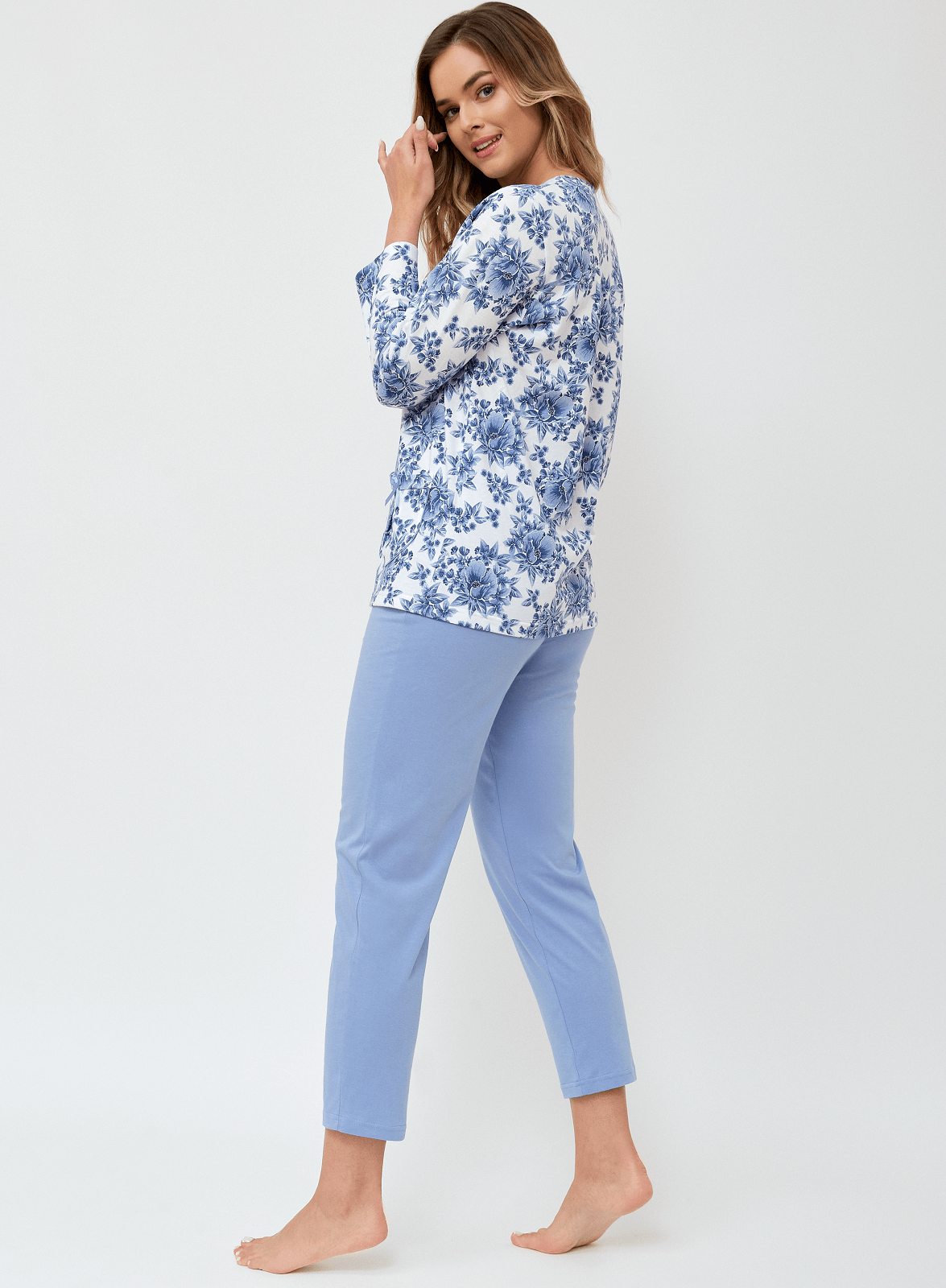 Komfortowa piżama damska z bawełny. Bluzka z długim rękawem, zapinana na guziki. Zdobiona pięknym, kwiatowym wzorem. Bluzeczka posiada praktyczne kieszonki po bokach. Spodnie długie w jednolitym kolorze z komfortową gumką w pasie.