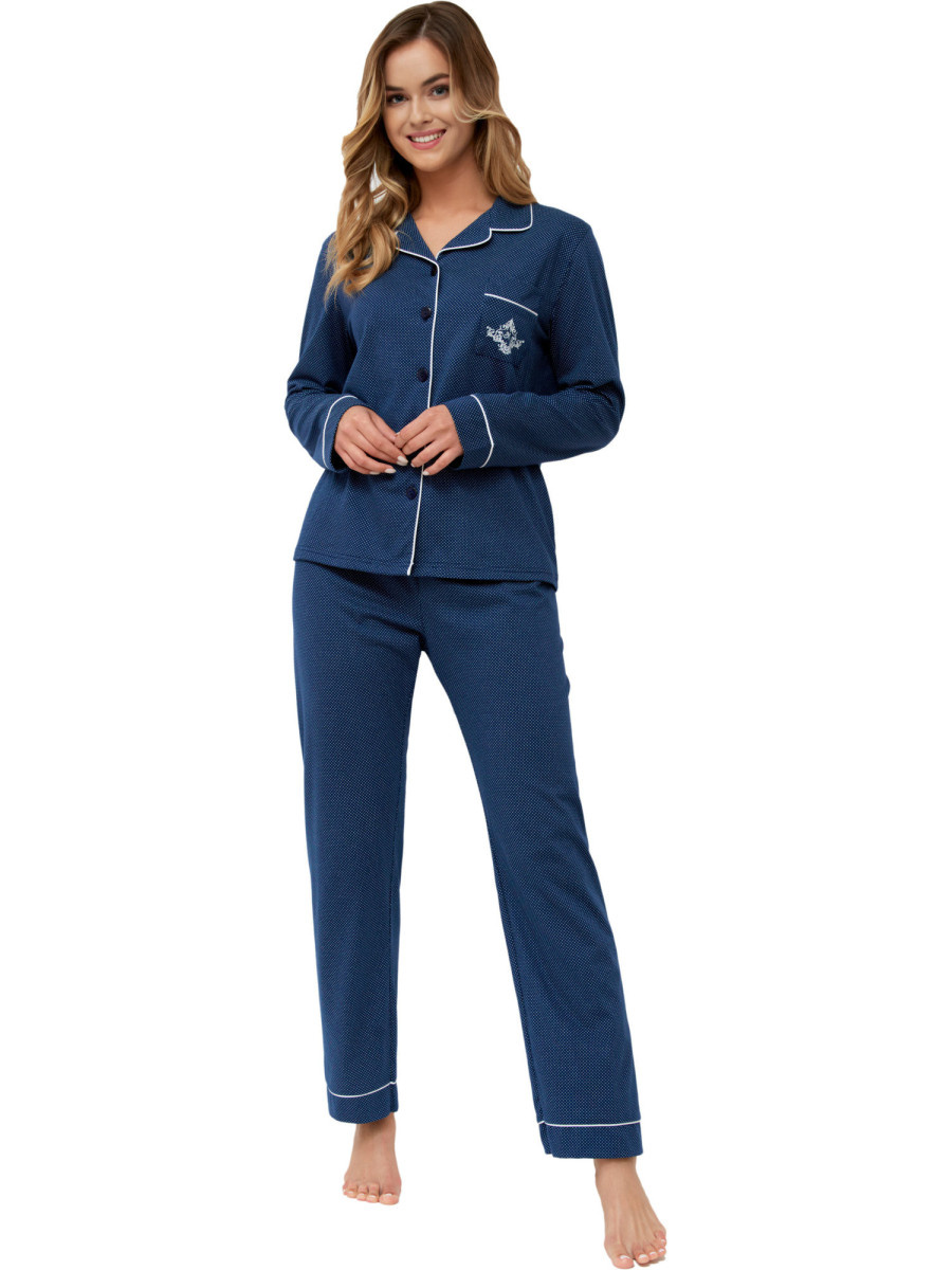 Piżama damska wykonana z wysokiej jakości bawełny. Rozpinana koszula z długim rękawem posiada elegancki kołnierzyk oraz kieszonkę z nadrukiem na wysokości piersi. Spodnie długie z elastyczną gumką w pasie. Całość w kolorze granatowym w subtelne kropki.