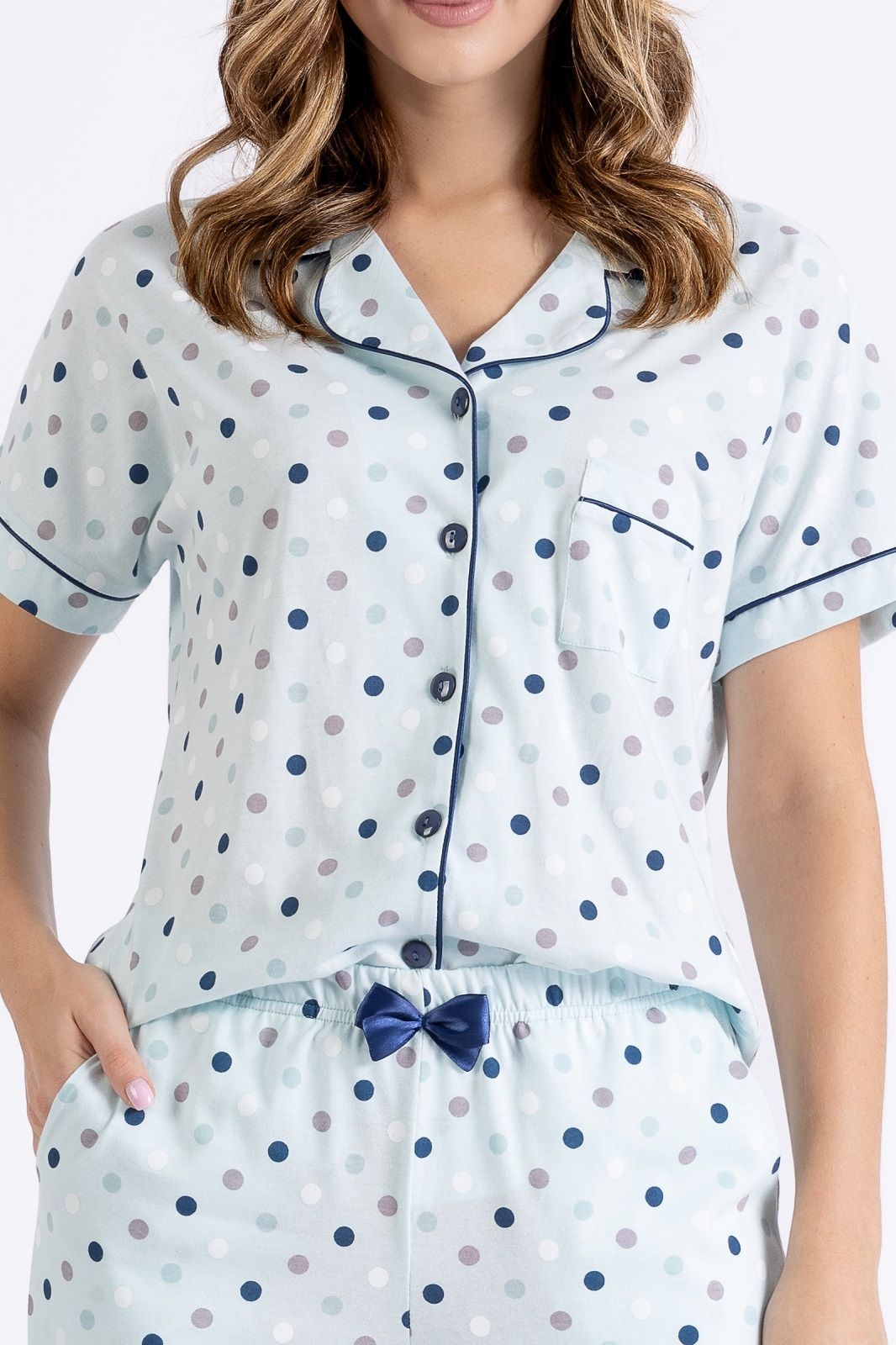 Bawełniana piżama damska Polskiej marki Leveza. Koszulka z krótkim rękawkiem, dekoltem w szpic i kołnierzykiem. Rozpinana po całości na guziki. Na wysokości piersi praktyczna kieszonka. Spodnie długie, delikatnie zwężane ku dołowi. Na obu bokach praktyczne kieszonki.