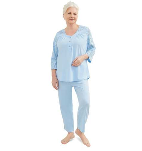 Klasyczna piżama damska wykonana z wysokiej jakości bawełny. Bluzka z rękawem 3/4, dekolt zapinany na guziki. Spodnie długie, jednolite.