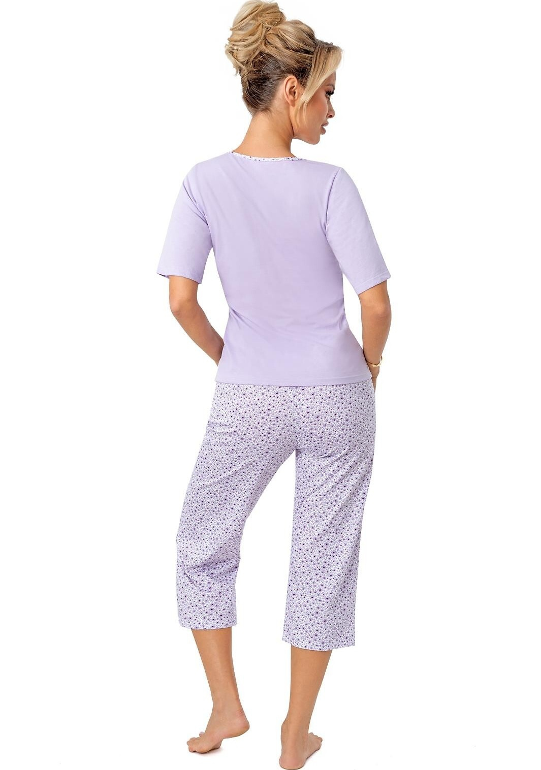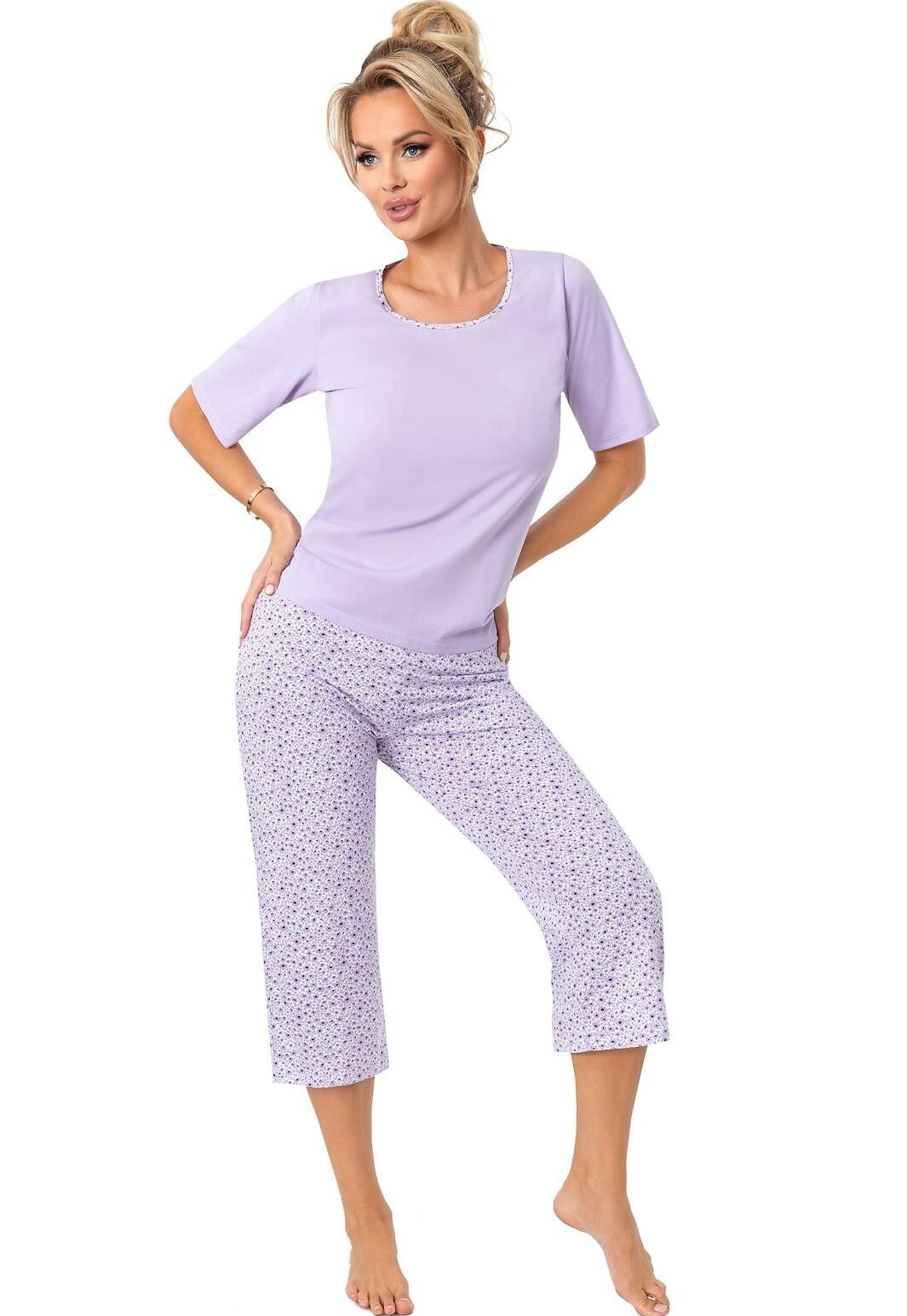 Damska piżama wykonana z wysokogatunkowej bawełny, zapewniającej komfort snu. Górna część to gładka bluzka z krótkimi rękawami i okrągłym dekoltem, wykończonym delikatną lamówką w kwiatowy wzór. Zestaw dopełniają spodnie o długości 3/4, ozdobione uroczym, kwiatowym nadrukiem.