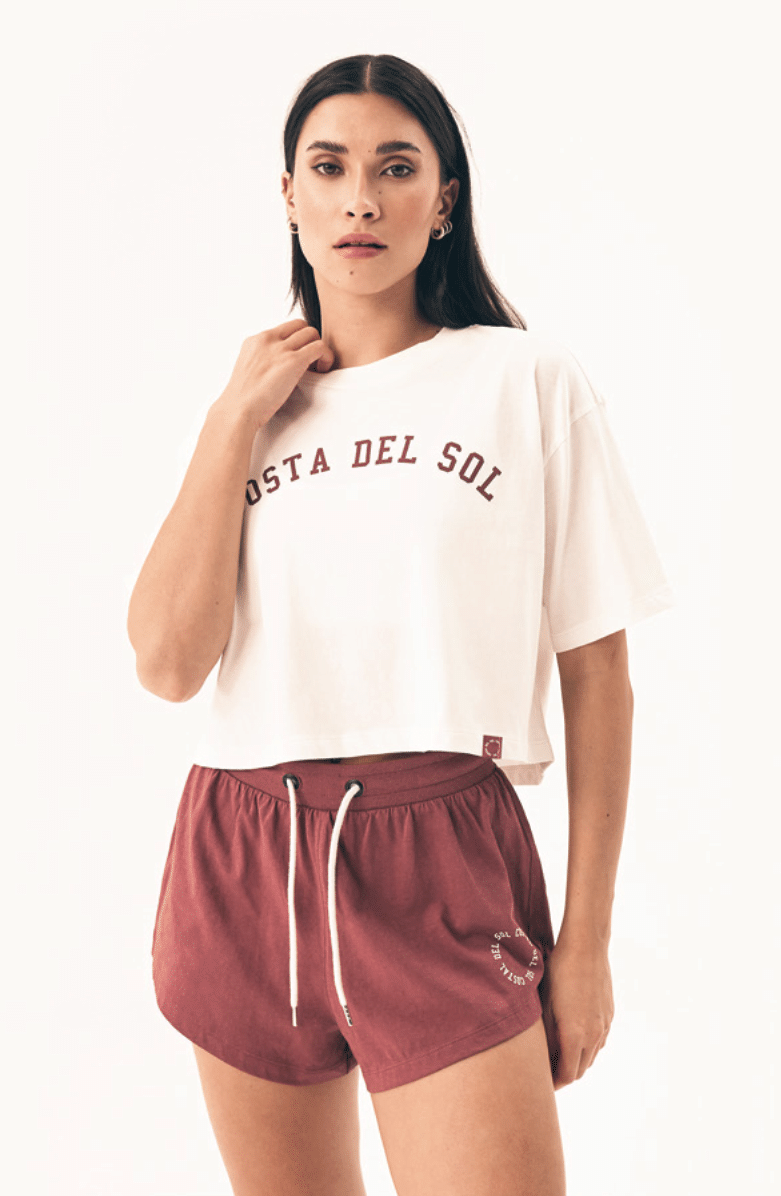 Bawełniana piżama damska z koszulką z krótkim rękawem, okrągłym dekoltem i spodenkami do kompletu. Koszulka o luźnym, komfortowym kroju w delikatnym, kremowym kolorze. Na przodzie koszulki napis "Costa Del Sol" co podkreśla jej letni klimat. Szorty w kontrastującym z koszulką, bordowym kolorze o modnym fasonie. W pasie wygodna gumka i sznurek do lepszego dopasowania.