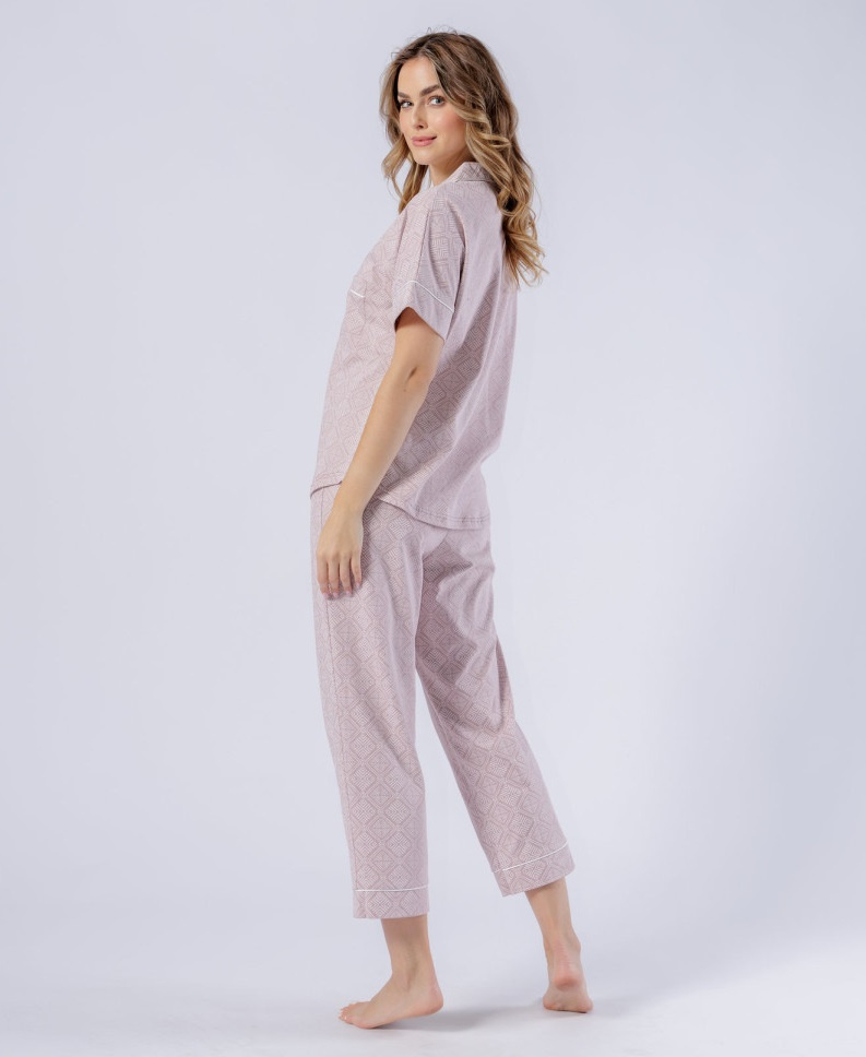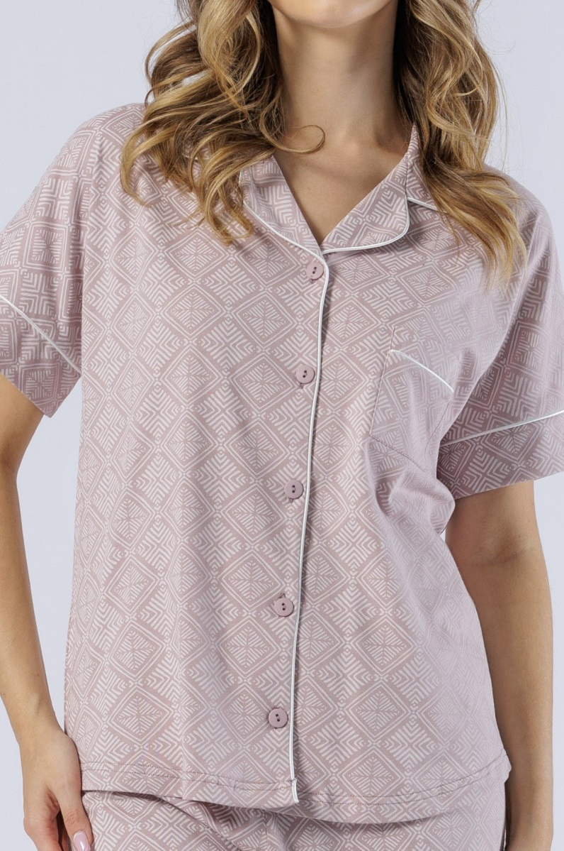 Rozpinana piżama damska z krótkim rękawem, wykonana w 100% z bawełny. Komfortowa i praktyczna. Na wysokości klatki piersiowej znajduje się mała kieszonka, dodająca uroku. W zestawie spodnie 3/4, idealne na cieplejsze noce. Piżama w pięknym beżowym odcieniu.