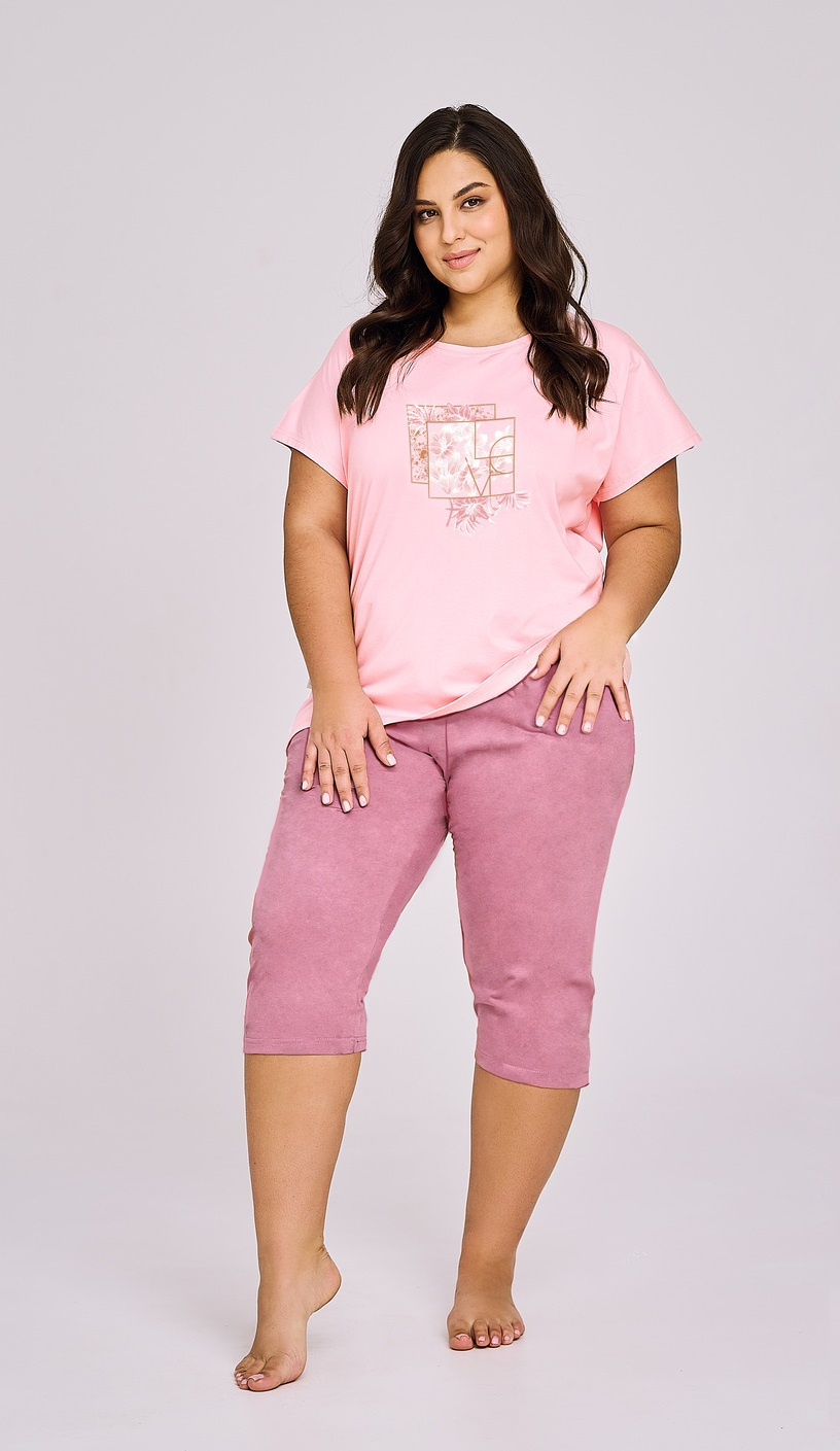 Bawełniana piżama Polskiej marki Taro. W skład piżamki wchodzi koszulka z krótkim rękawem z ozdobną grafiką na przodzie. Koszulka z półokrągłym dekoltem. Spodnie o jednolitym kolorze i długości 3/4, za kolano. W pasie spodenek wygodna gumka.