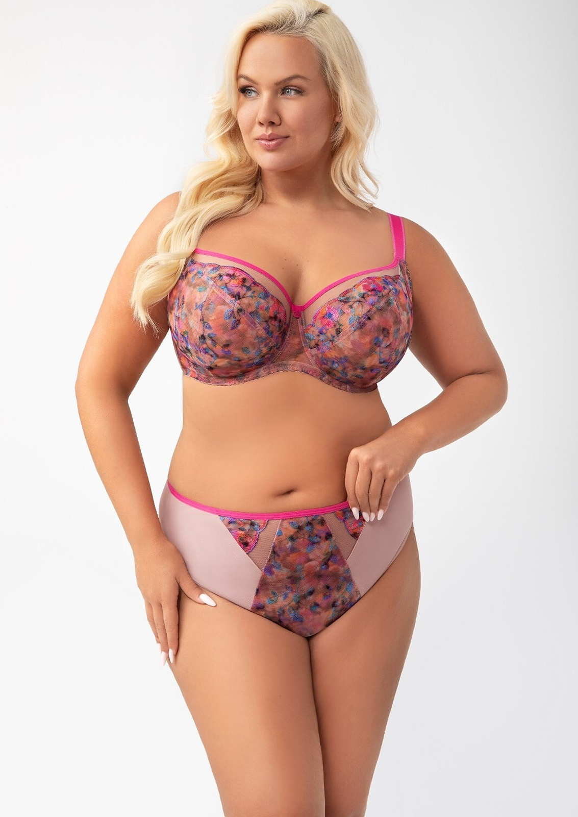 Biustonosz miękki K927 VIVIAN przeznaczony dla kobiet ze średnim, dużym oraz bardzo dużym biustem. Zapewnia efekt bardzo mocnego uniesienia i zebrania biustu do środka. 3-częściowe miski wykonane z haftu oraz plenu haftowanego z nadrukiem na tiulu stabilnym. Górna krawędź miski wykończona taśmą w kontrastowym kolorze przechodzi płynnie do ramiączka powodując lepsze podtrzymanie biustu. Tył z transparentnej lycry zapewniającej bardzo dobre dopasowanie i podtrzymanie. Fiszbiny boczne zapobiegające zwijaniu się materiału. W zależności od rozmiaru dwu lub trzyrzędowa haftka z trójstopniową regulacją obwodu. Nieodpinane, regulowane ramiączka w trzech szerokościach. Metalowe elementy w kolorze różowym (nie zawierają niklu).