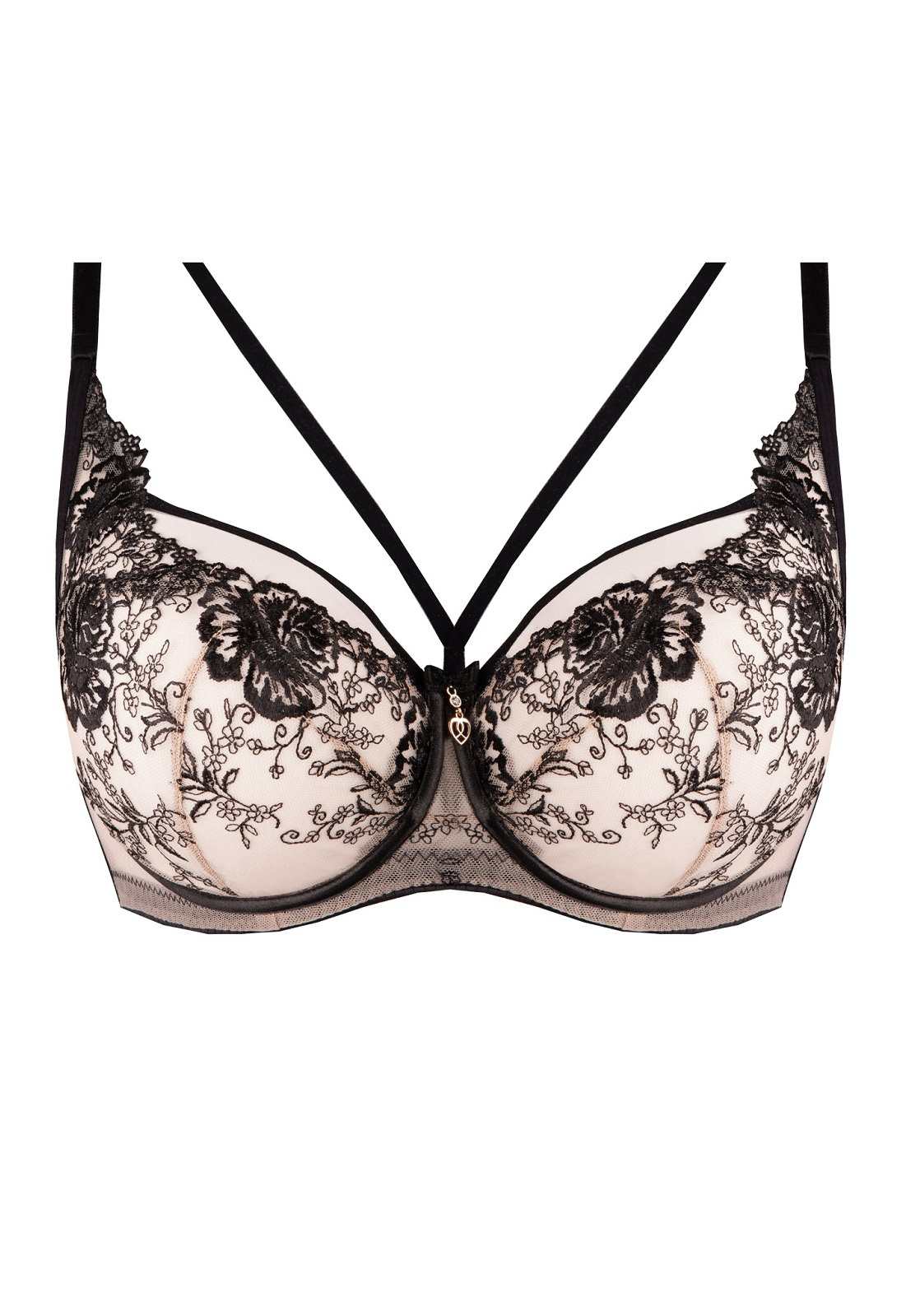 Biustonosz uszyty z delikatnego, elastycznego tiulu w odcieniu beżu. Na miseczkach znajduje się czarny, kwiatowy haft, który subtelnie zdobi materiał i podkreśla kobiece kształty.