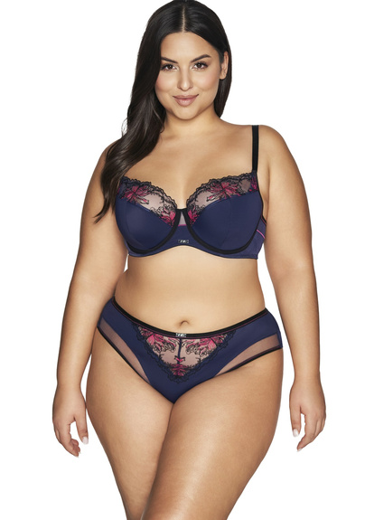 Elegancki i niezwykle zmysłowy Mistral uwodzi zmysły. Dolna część misek tego półusztywnianego biustonosza dla zwiększenia komfortu użytkowania wzmocniona została miękką pianką, a górne partie tworzy misternie utkany roślinny haft. Czarno-fuksjowe kwiaty pięknie komponują się z atramentowym odcieniem granatu dzianiny pokrywającej dolne miski. Dodatkową ozdobą biustonosza jest intensywnie różowy szew dzielący obwód i mostek oraz czarne lamówki okalające biust. Niezrównana konstrukcja K-1030 zastosowana w AV 2119 to gwarancja wygody i właściwej stabilizacji biustu, odciążającej plecy i ramiona.