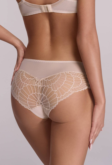Majtki pełne, damskie wykonane z czarnej, pięknej, ażurowej koronki. W górnej linii tiulowa siateczka. W pasie wygodna gumka.