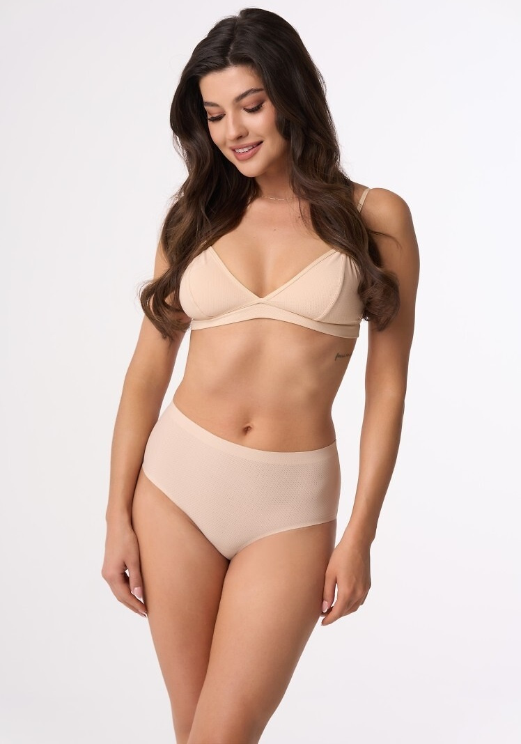 Oddychające figi damskie, wykonane z delikatnego, siatkowanego materiału. Tył posiada subtelną koronkę o kwiatowym motywie. Wycinane laserowo, wykończone płasko, dzięki czemu nie odznaczają się pod ubraniem.