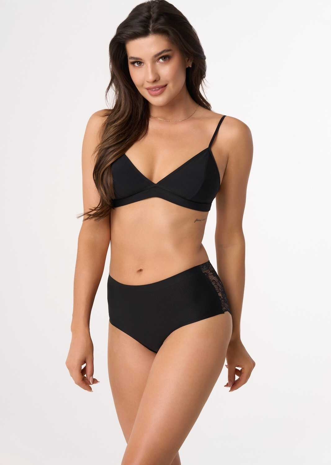 Oddychające figi damskie, wykonane z delikatnego, siatkowanego materiału. Tył posiada subtelną koronkę o kwiatowym motywie. Wycinane laserowo, wykończone płasko, dzięki czemu nie odznaczają się pod ubraniem.