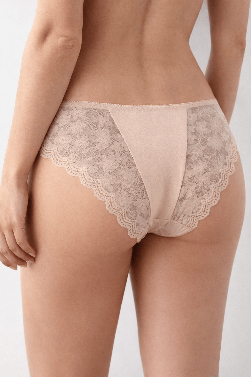 Kobiece figi damskie koronkowe wykonane z wysokiej jakości bawełny. Wykończone koronką o kwiatowym motywie. Klasyczny krój, który zapewnia komfort noszenia. Idealnie dopasowują się do kształtu sylwetki i przylegają do ciała.