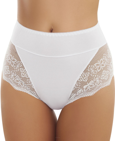 Pełne figi damskie o zabudowanym kroju. Figi z wysokim stanem do pępka. Wykonane z gładkiej, jednolitej bawełny w połączeniu z piękną ażurową koronką na bokach.
