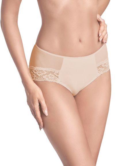 Wysokie figi damskie o pełnym kroju w kolorze beżowym. Wykonane z gładkiej dzianiny, tiulowej siateczki oraz koronki o kwiatowym motywie.