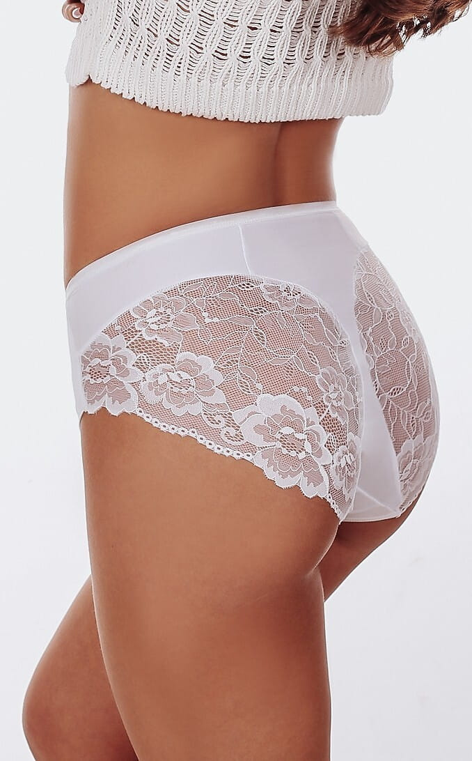 Klasyczne figi damskie, które łączą wygodę z eleganckim wykończeniem. Przód wykonany z gładkiej, delikatnej mikrofibry, tył z efektownej koronki w kwiatowy wzór.