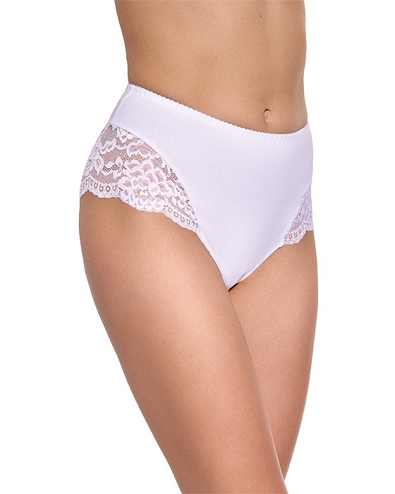 Figi damskie w kolorze białym o wyższym zabudowanym kroju. Wykonane z wysokiej jakości bawełny. Biodra ozdobione koronką.