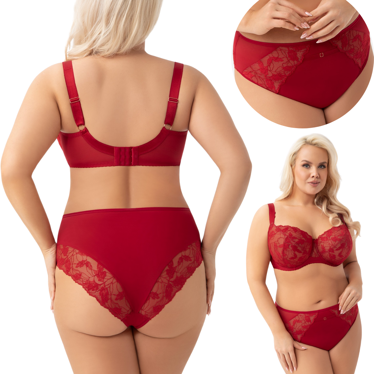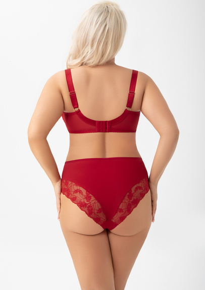 Figi damskie z wyższym stanem. Zabudowany fason zasłaniający prawie całe pośladki. Wykonane z tiulu elastycznego oraz koronki. Tył wykończony brzegiem koronki. Metalowe elementy w kolorze różowego złota (nie zawierają niklu). Bawełniany kroczek.