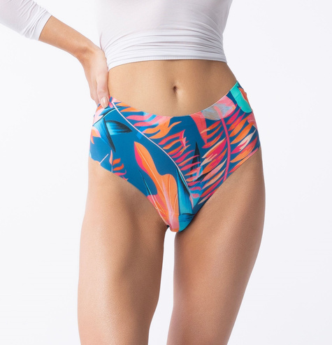 Figi z wysokim stanem o kroju odsłaniającym pośladki. Zabudowane w biodrach. Wycinane laserowo, bezszwowe.