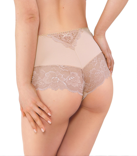 Wysokie figi damskie, o kroju odsłaniającym pośladki. Wykonane z gładkiej mikrofibry w połączeniu z subtelną koronką.