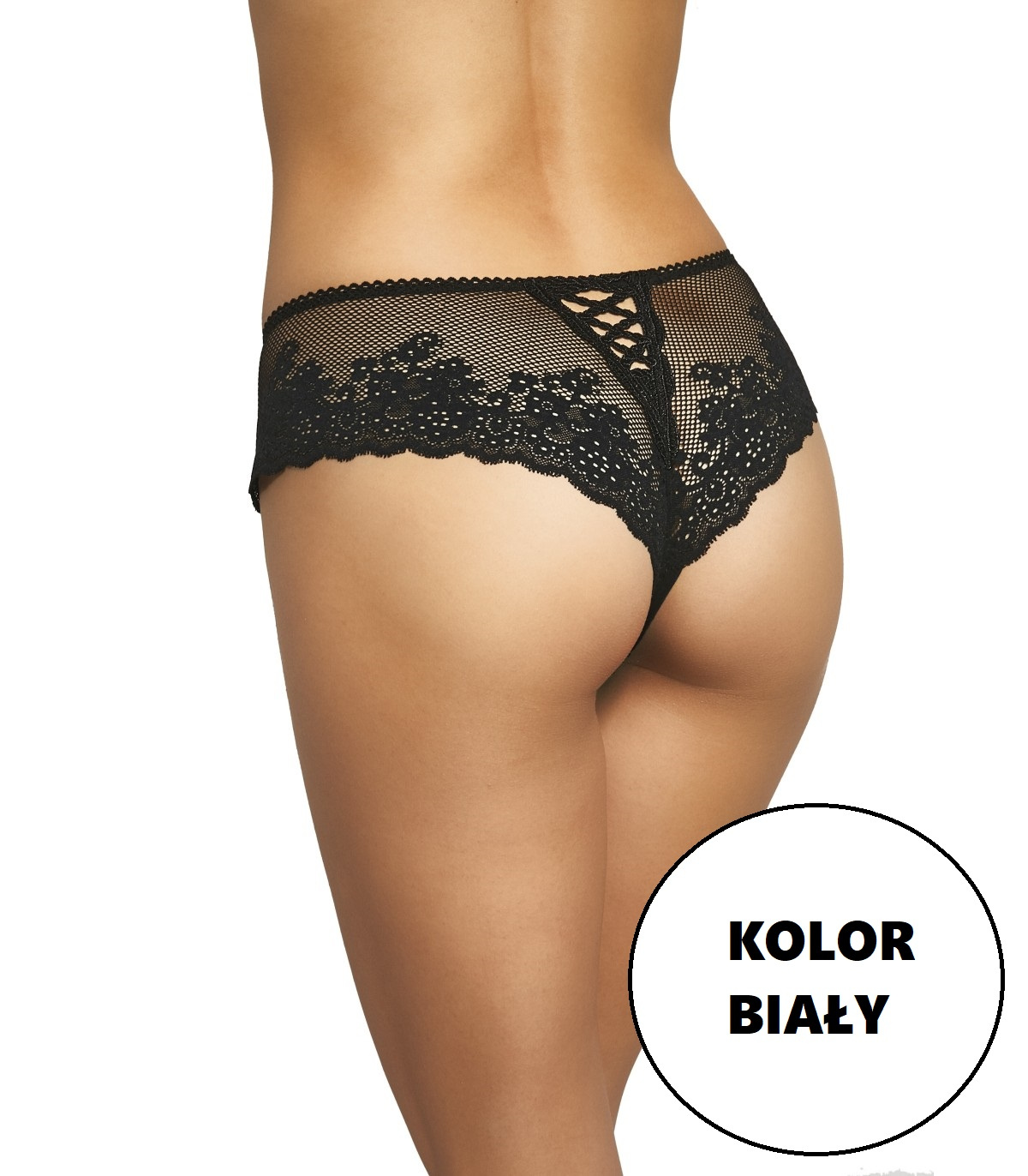 Bawełniane szorty damskie o zabudowanym kroju na biodrach. Przód z gładkiej, kryjącej bawełny. Boki i tył wykonane z pięknej koronki.