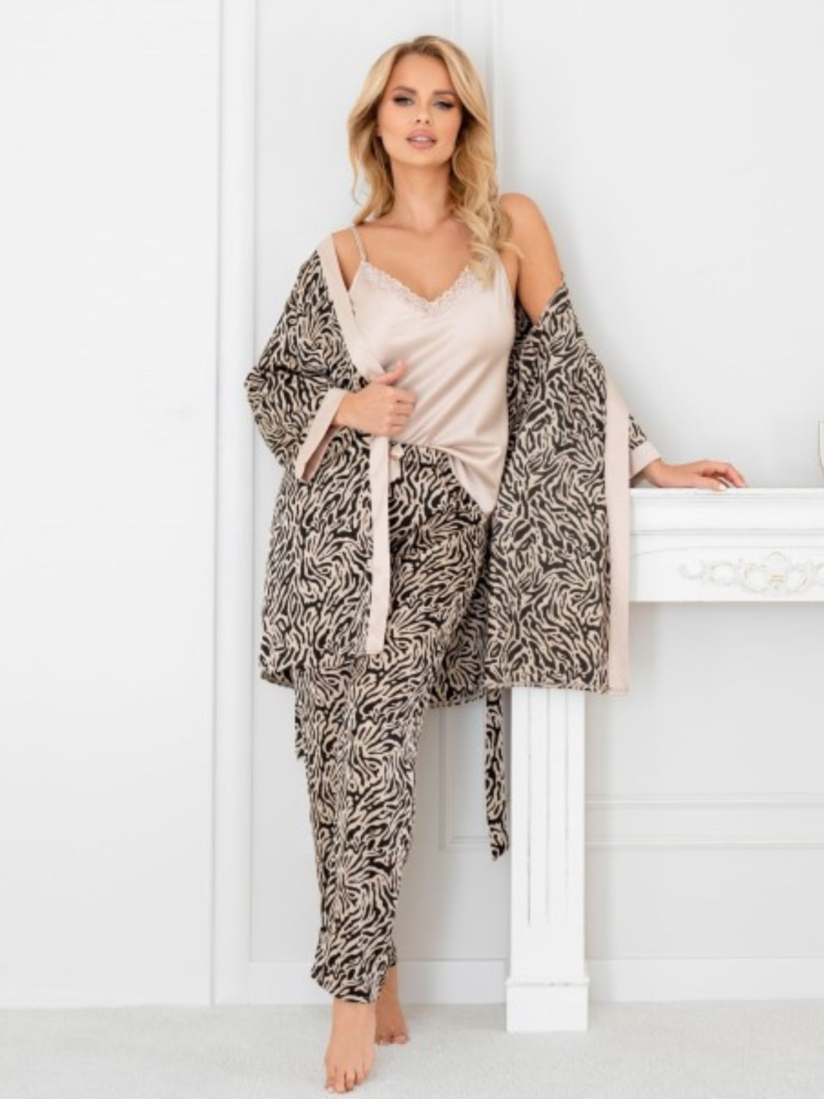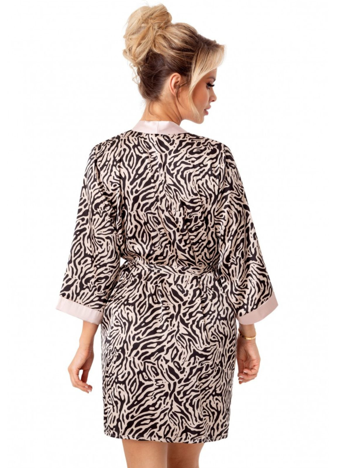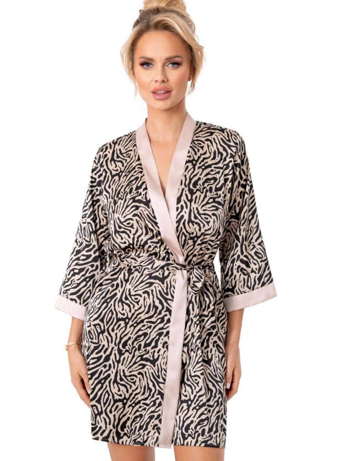 Krótki szlafrok damski wykonany z delikatnej, miękkiej satyny z efektownym zwierzęcym printem, który doda Twojej stylizacji wyjątkowego charakteru. Model posiada luźny rękaw o długości 7/8 oraz eleganckie, jednolite obszycie w subtelnym beżowym kolorze. Szlafrok jest wiązany w pasie praktycznym paskiem, dzięki czemu idealnie dopasujesz go do sylwetki.