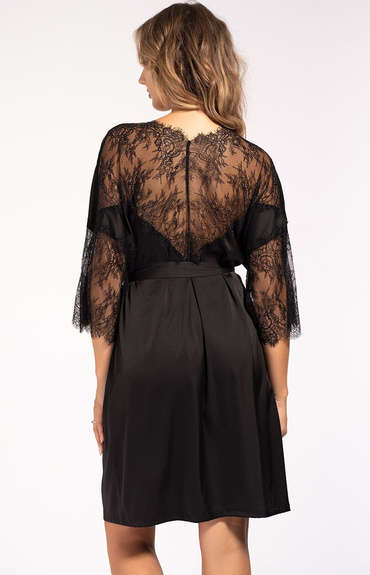 Elegancki szlafrok damski w kolorze czarnym. Połączenie delikatnej koronki z luksusową satyną. Górna część pleców oraz rękawy wykonane z delikatnej koronki dodają subtelności i elegancji, natomiast wiązanie w pasie umożliwia idealne dopasowanie, podkreślając kobiecą sylwetkę. Długość do połowy uda sprawia, że szlafrok jest komfortowy w noszeniu, a jednocześnie niezwykle stylowy,