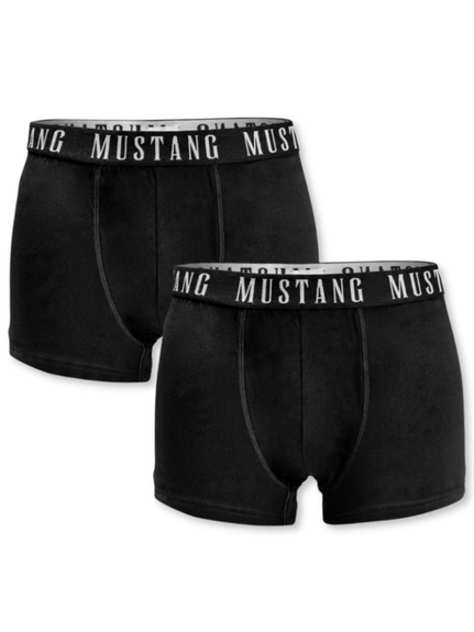Zestaw 2 par czarnych bokserek męskich marki MUSTANG. Uszyte z wysokiej jakości bawełny z dodatkiem elastanu. Szeroka, elastyczna guma w pasie z logo gwarantuje stabilność bez ucisku, a płaskie szwy zwiększają komfort noszenia.