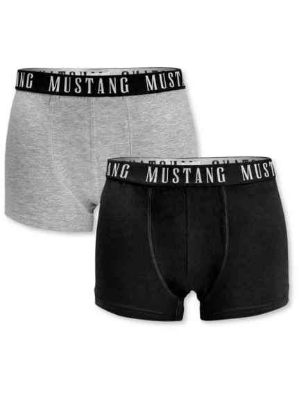 Zestaw 2 par bokserek męskich MUSTANG. Uszyte z miękkiej bawełny z dodatkiem elastanu oraz wiskozy. Płaskie szwy minimalizują ryzyko otarć, a szeroka gumka z logo "MUSTANG" dobrze trzyma się na ciele, nie uciskając. W zestawie znajdują się dwie pary – jedna w kolorze czarnym, druga w odcieniu szarości.