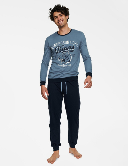 Dwuczęściowa męska piżama HENDERSON Burn to wygodny komplet do spania, który składa się z prostej koszulki z długim rękawem i okrągłym dekoltem oraz wygodnych, długich spodni. Mankiety, dół koszuli oraz nogawki wykończone są szerokim ściągaczem. Na koszulce umieszczono spory nadruk nawiązujący stylem do emblematów drużyn sportowych. Całość wykonano z przyjemnej w dotyku bawełny, która zagwarantuje Ci komfort podczas snu.