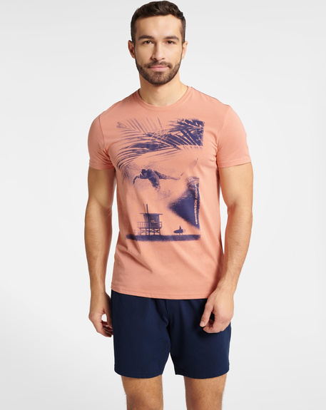 Piżama męska z wysokiej jakości bawełny. Koszulka z krótkim rękawem ozdobiona nadrukiem. Spodenki jednolite w kolorze granatowym z wygodną gumką w pasie.