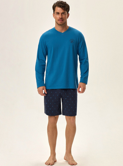 Bawełniana piżama męska, koszulka z długim rękawem, dekolt w szpic. Przód zdobiony delikatnym nadrukiem na piersi. Wzorzyste spodenki o długości do kolan. W pasie szeroka gumka z logo.