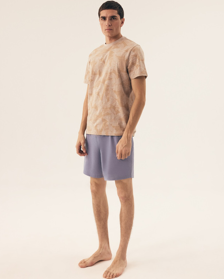 Klasyczna piżama męska z krótkim rękawkiem i spodenkami. Koszulka w liściastą grafikę w beżowej tonacji barw. Spodenki w szarym kolorze. Komfortowa piżama jest gwarancją komfortowego snu. Koszulka z okrągłym dekoltem, spodenki z wygodną gumką w pasie.