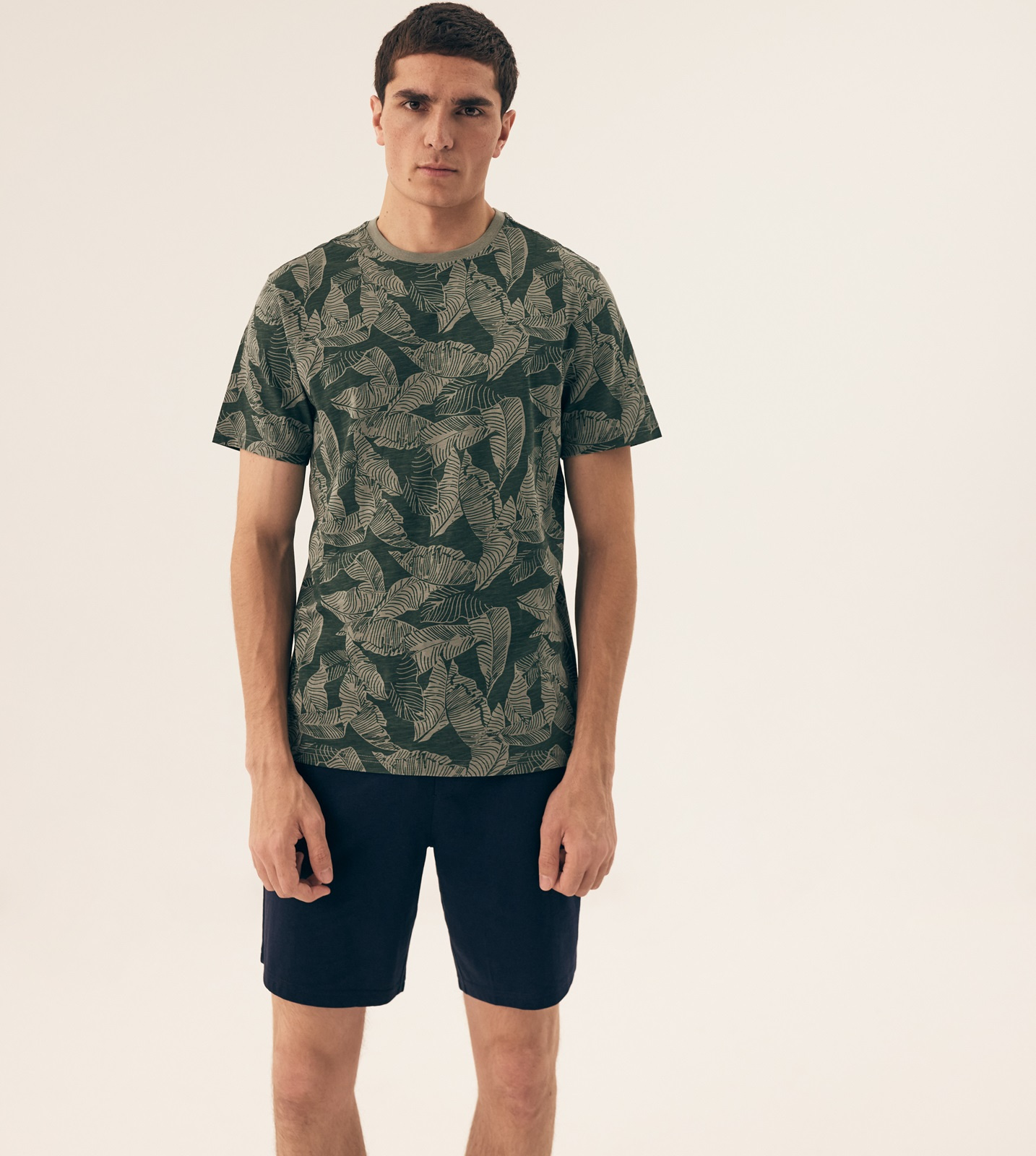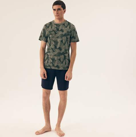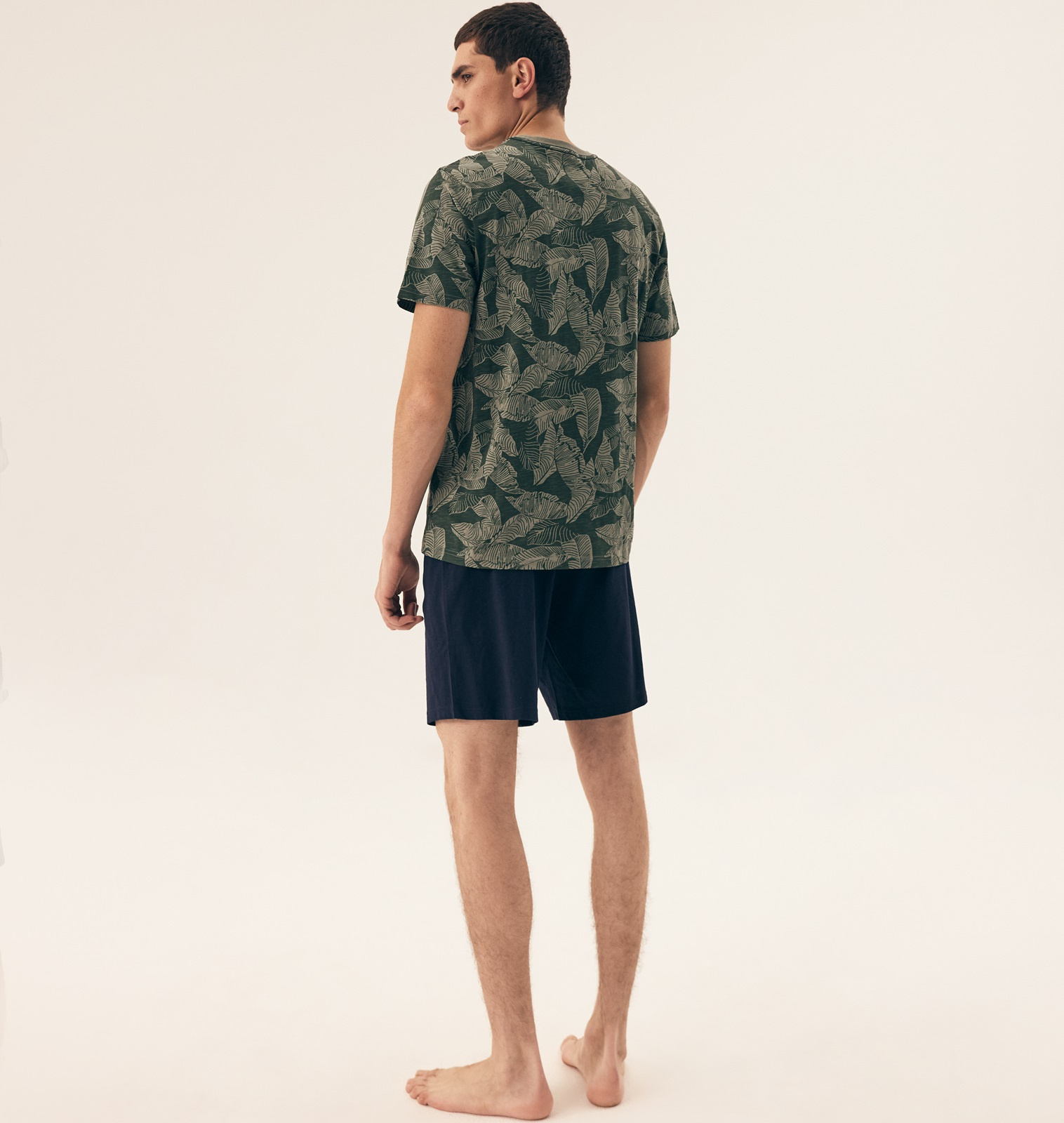 Klasyczna piżama męska z krótkim rękawkiem i spodenkami. Koszulka w liściastą grafikę w zielonej tonacji barw. Spodenki w granatowym kolorze. Komfortowa piżama jest gwarancją komfortowego snu. Koszulka z okrągłym dekoltem, spodenki z wygodną gumką w pasie.