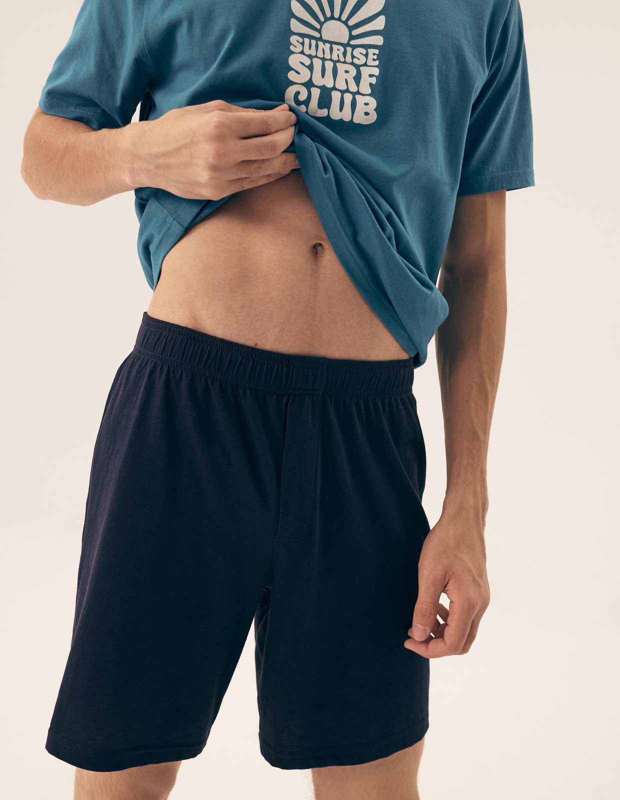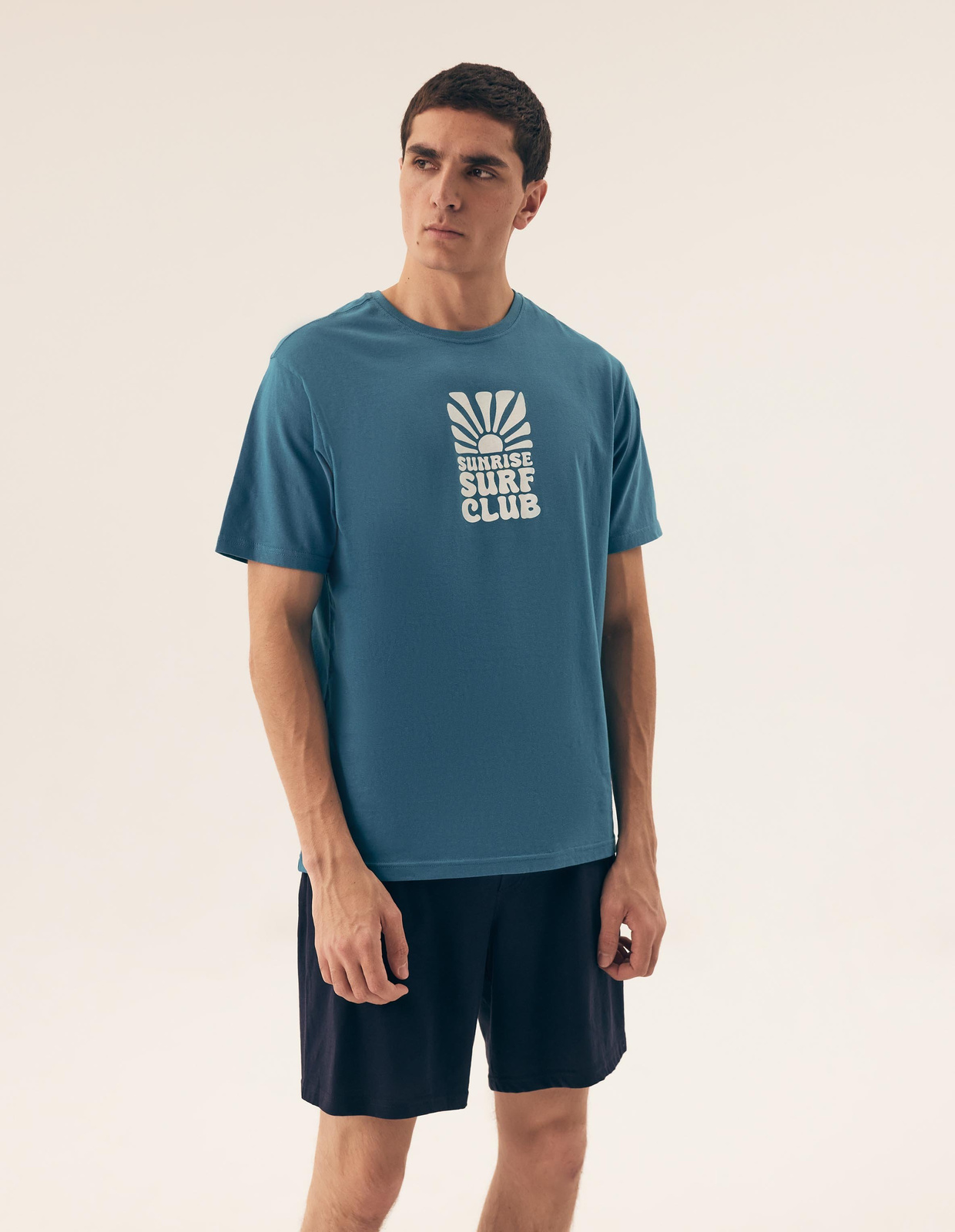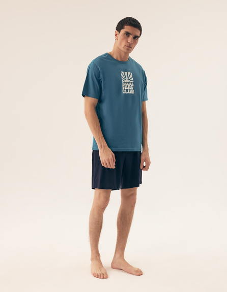 Piżama męska wykonana z wysokiej jakości bawełny. Koszulka z krótkim rękawem, okrągłym dekoltem oraz delikatnym nadrukiem na przodzie. Spodenki krótkie z wygodną gumką w pasie.