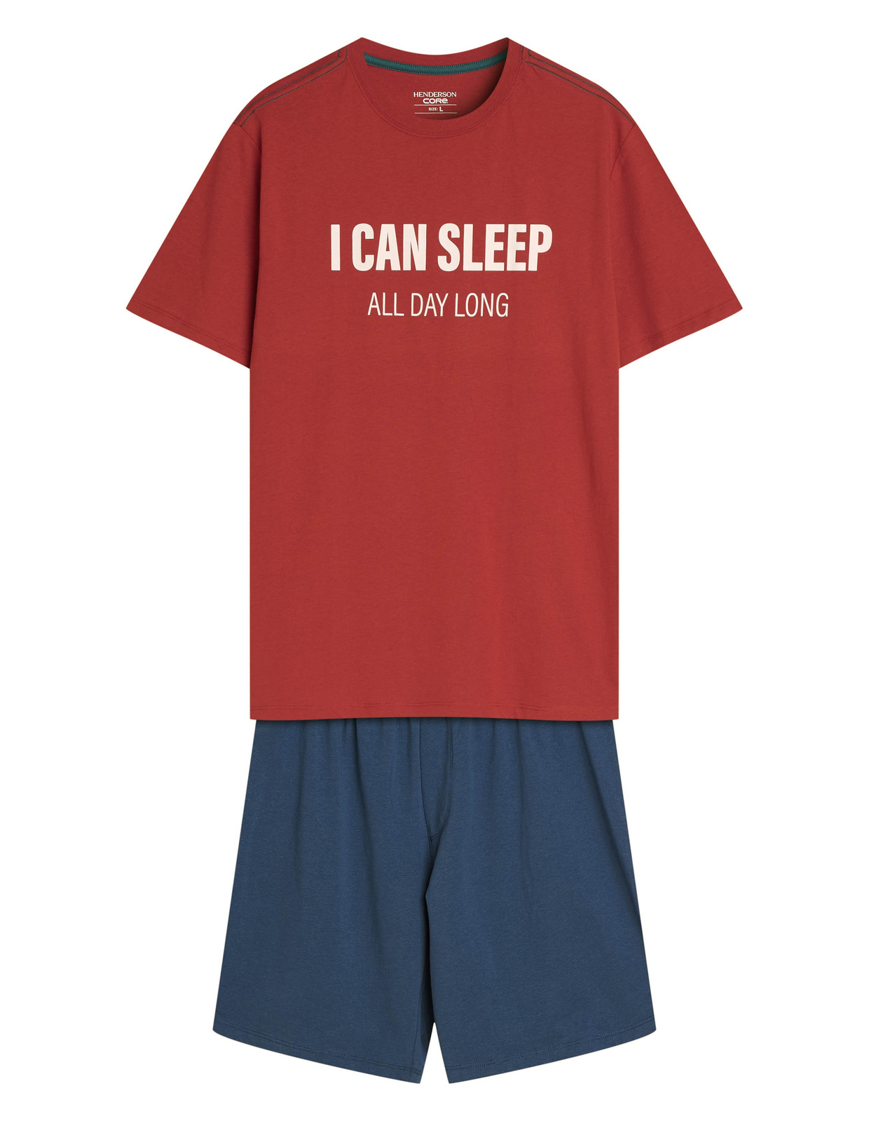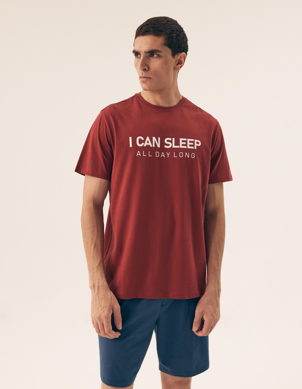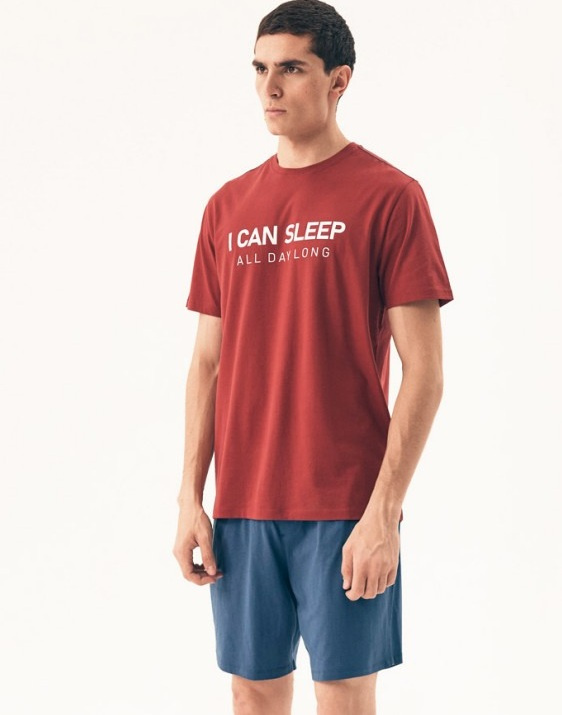 Bawełniana piżama męska. Koszulka w kolorze bordo z krótkim rękawem oraz okrągłym dekoltem. Przód koszulki zdobi napis. Krótkie spodenki z wygodną gumką w pasie.