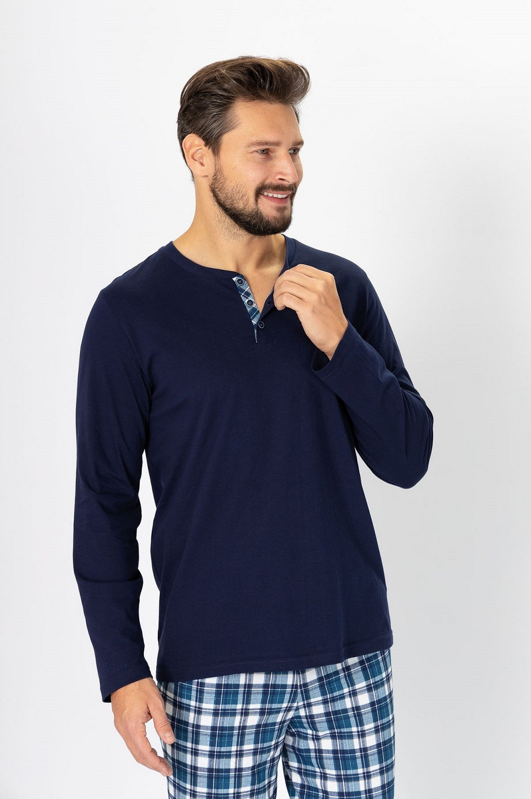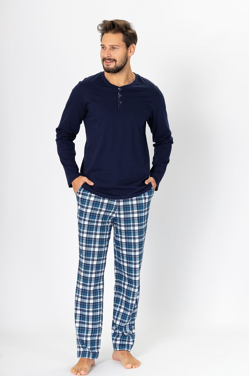 Piżama męska Hotberg Damien 1142 łączy klasyczny, elegancki design z wysokim komfortem użytkowania. Luźny fason i miękka bawełna zapewniają swobodę ruchów i przyjemne uczucie podczas snu. Gładka bluzka zestawiona ze spodniami w kratę tworzy harmonijny i estetyczny komplet. Ekologiczne wykończenie dzianiny podnosi komfort użytkowania, a praktyczne kieszenie i regulowany pas w spodniach zwiększają funkcjonalność produktu.