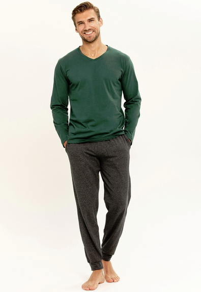 Bawełniana piżama męska, koszulka z długim rękawem w kolorze butelkowej zieleni. Dekolt w szpic. Długie spodnie z praktycznymi kieszeniami, nogawki zakończone ściągaczem.