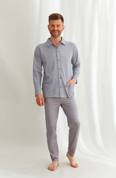 Piżama męska z bawełny. Wzorzysta koszulka rozpinana na guziki. Praktyczne kieszonki na koszulce. Spodnie jednolite.
