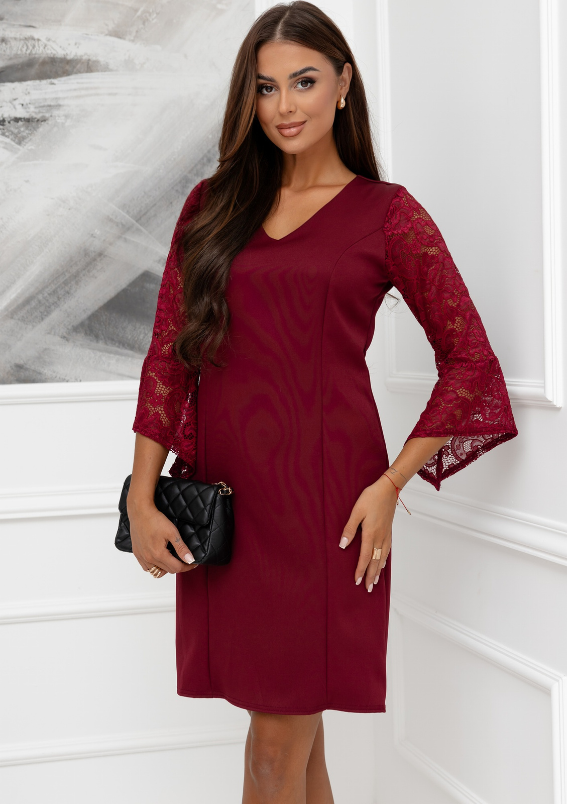 Sukienka o prostym kroju z dekoltem w serek idealnie dopasowuje się do każdej sylwetki. Wyjątkowy charakter nadają jej koronkowe rękawy 3/4.