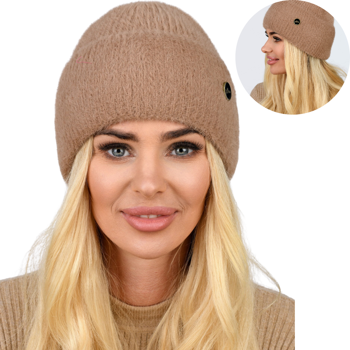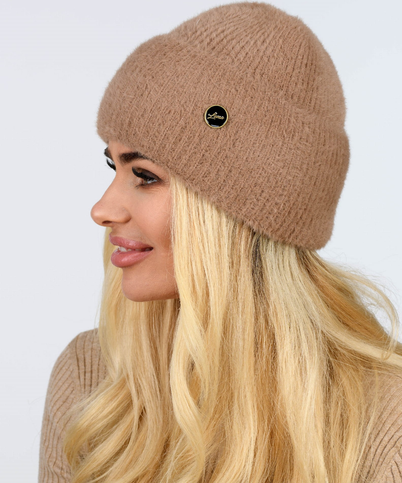 Alpakowa czapka damska LEMA Rosa. Model czapki beanie bez pompona, z wywinięciem ozdobiona broszką z logo firmy LEMA. Wykonana z ciepłej i miłej w dotyku alpakowej przędzy (ekologiczna alpaka). Rozmiar uniwersalny (50cm-58cm). Wyprodukowana w Polsce ze szczególną starannością z wysokogatunkowej przędzy.
