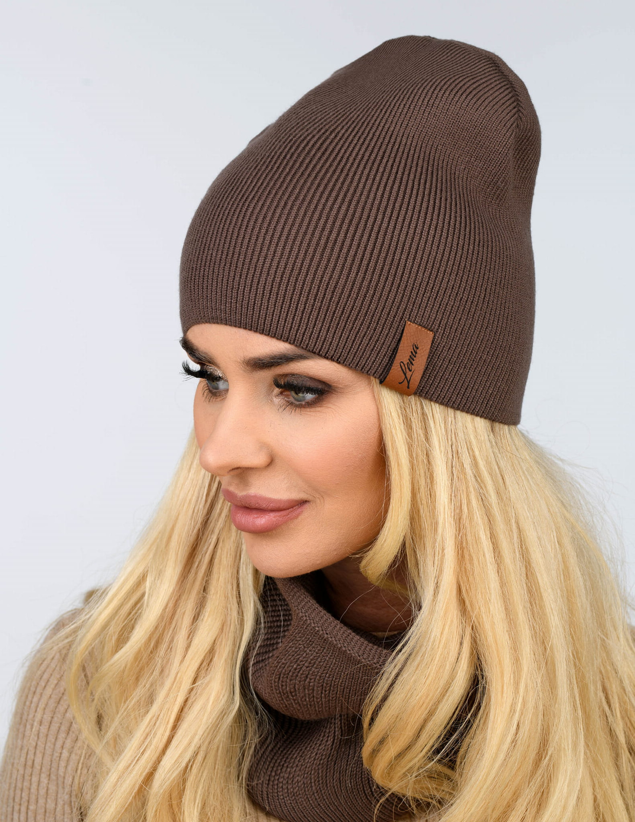 Klasyczny wiskozowy komplet damski LEMA i szal damski typu komin / tuba. Czapka damska bez pompona typu krasnal ozdobiona skórzaną etykietą z logo firmy Lema.  Zestaw wykonany z ciepłej i miłej w dotyku wiskozowej przędzy w modny prążkowany wzór. Zimowy komplet damski dostępny w szerokiej gamie modnych kolorów. Rozmiar uniwersalny (50cm-58cm). Wyprodukowany w Polsce ze szczególną starannością.