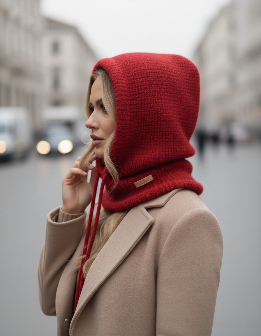 Modny kaptur-komin damski zimowy wykonany z miłej w dotyku alpakowej przędzy. Rozmiar uniwersalny (48cm-60cm). Wyprodukowany w Polsce ze szczególną starannością. Dzianinowy kaptur zimowy poza walorami modowymi to bardzo praktyczne nakrycie głowy. Otwór kaptura regulowany jest za pomocą dzianinowego troczka w kolorze kaptura. Skutecznie ochroni przed zimnym wiatrem i mrozem. Stanowi idealny dodatek do klasycznego wełnianego płaszcza lub kurtki.