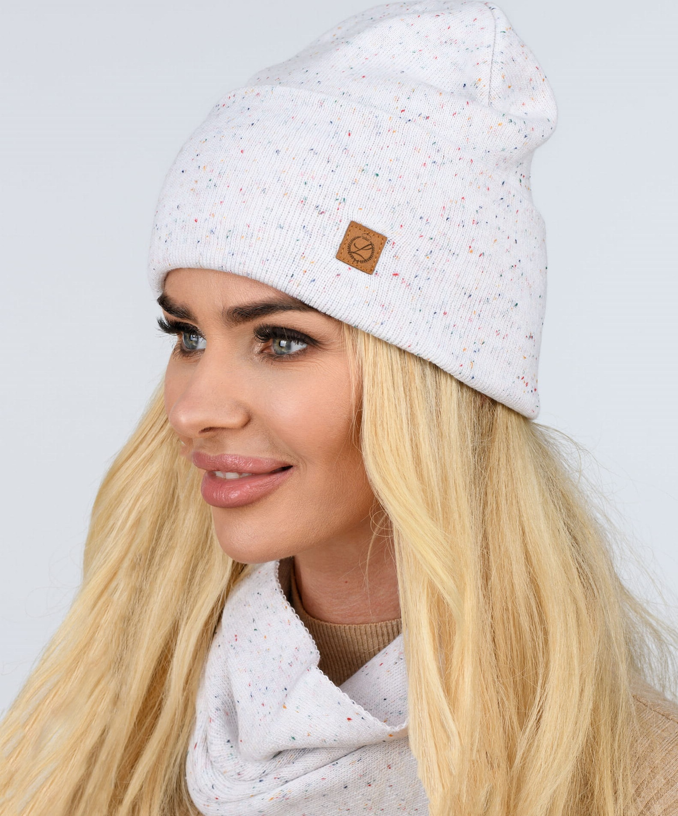 Klasyczny komplet damski LEMA. Fason czapki beanie (czapka z wywinięciem) ozdobiona modną etykietą z logo firmy. Szal typu komin / tuba. Czapka wykonana z bawełnianej, ciepłej dzianiny. Rozmiar uniwersalny (50cm-58cm). Wyprodukowana w Polsce ze szczególną starannością z wysokogatunkowej bawełnianej przędzy.