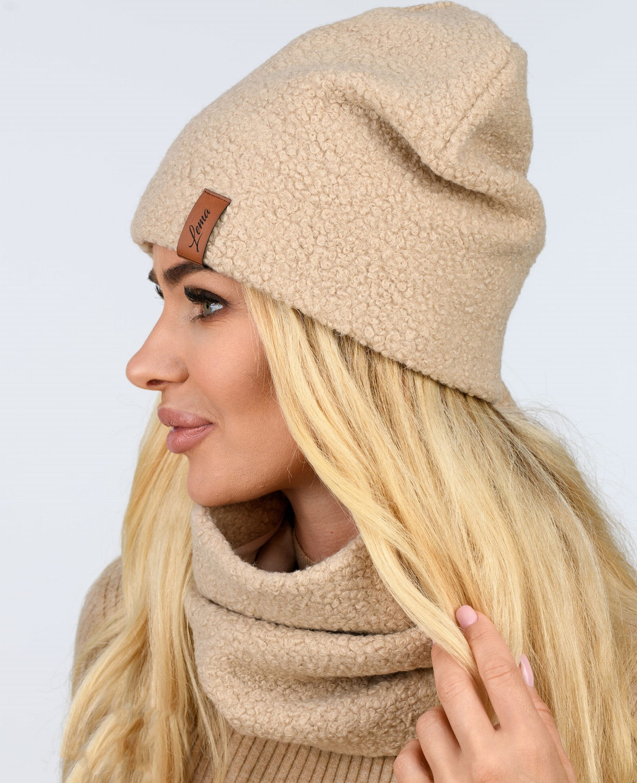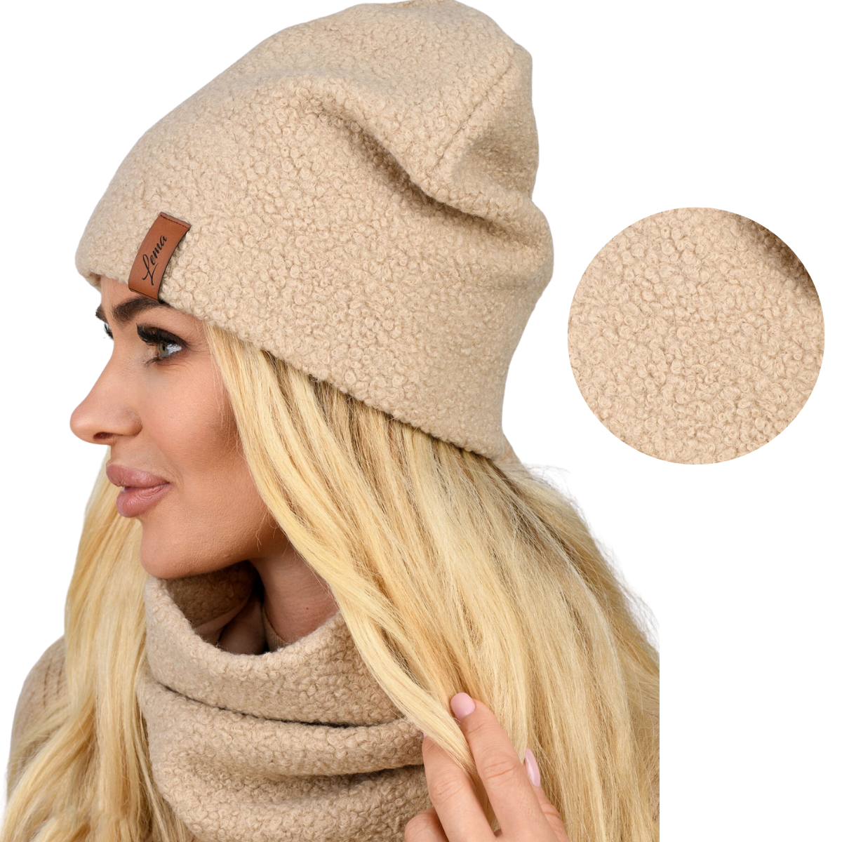 Modny komplet zimowy Boucle. Zestaw składa się z czapki damskiej z etykietą oraz kominu/tuby. Wykonany z dzianiny typu boucle (bukla). Rozmiar uniwersalny (52cm-58cm). Wyprodukowana w Polsce ze szczególną starannością.