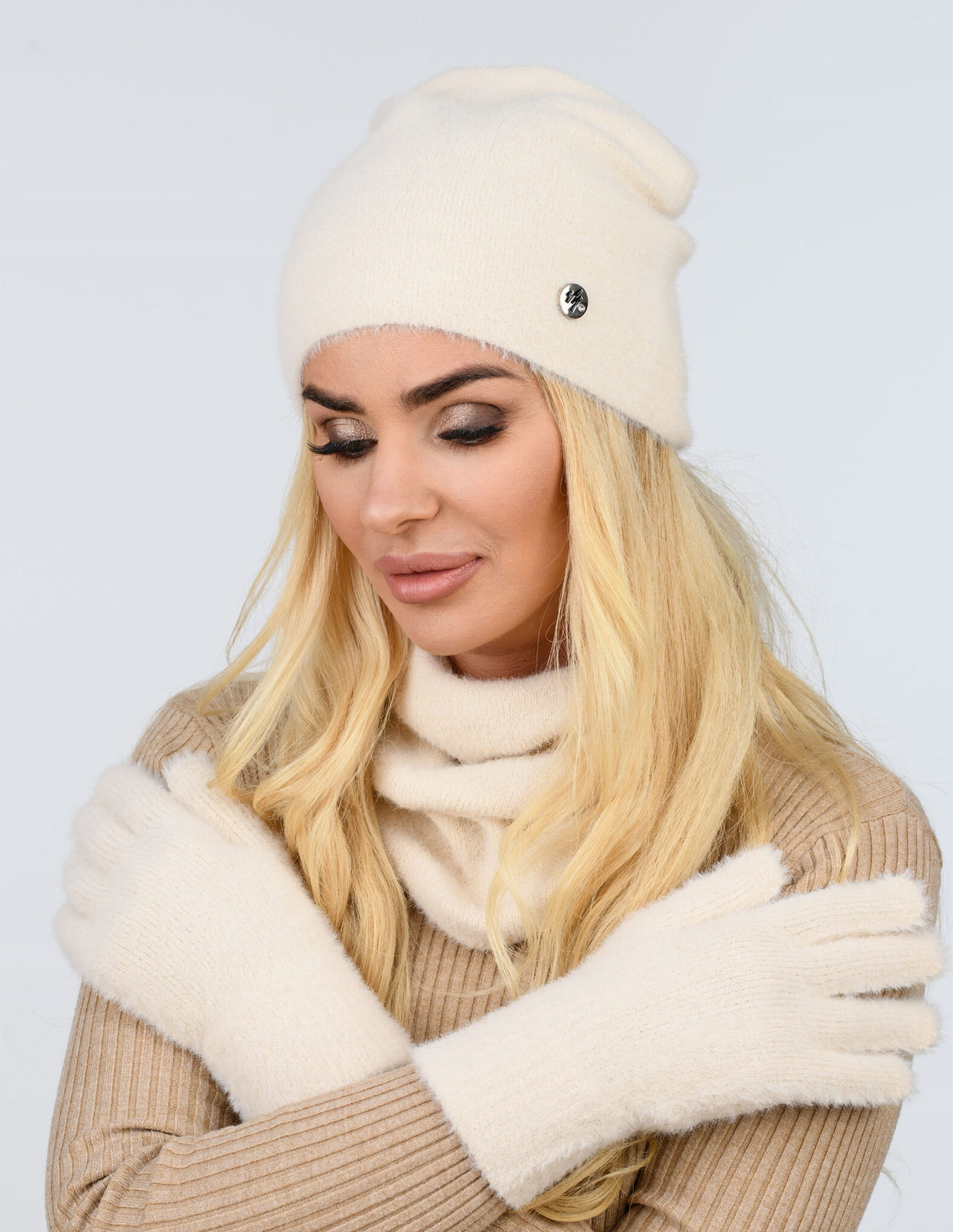 lasyczny zestaw zimowy damski Marlu model Classic: Skład zestawu: alpakowa czapka zimowa damska typu Smerfetka , szal typu komin / tuba oraz rękawiczki. Czapka ozdobiona broszką z logo firmy Marlu, komin typu tuba, rękawiczki pięciopalcowe. Szeroka gama modnych kolorów. Rozmiar uniwersalny (52cm-58cm). Wyprodukowana w Polsce ze szczególną starannością z wysokogatunkowej przędzy.